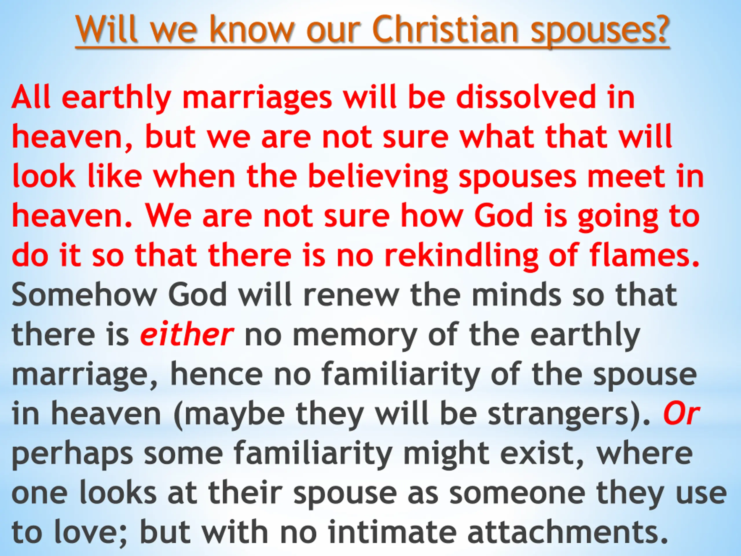 Will we know our Christian spouses? All earthly marriages will be dissolved in heaven, but we are not sure what that will look like when the believing spouses meet in heaven. We are not sure how God is going to do it so that there is no rekindling of flames. Somehow God will renew the minds so that there is either no memory of the earthly marriage, hence no familiarity of the spouse in heaven (maybe they will be strangers). Or perhaps some familiarity might exist, where one looks at their spouse as someone they use to love; but with no intimate attachments.