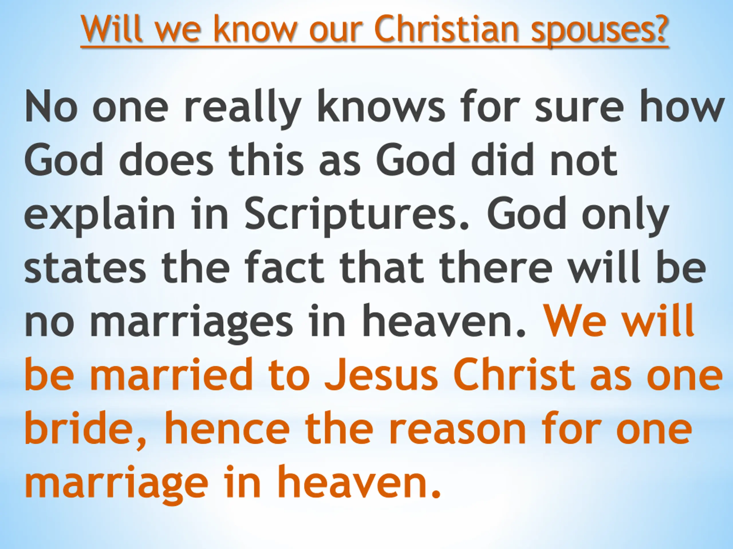 Will we know our Christian spouses? No one really knows for sure how God does this as God did not explain in Scriptures. God only states the fact that there will be no marriages in heaven. We will be married to Jesus Christ as one bride, hence the reason for one marriage in heaven.