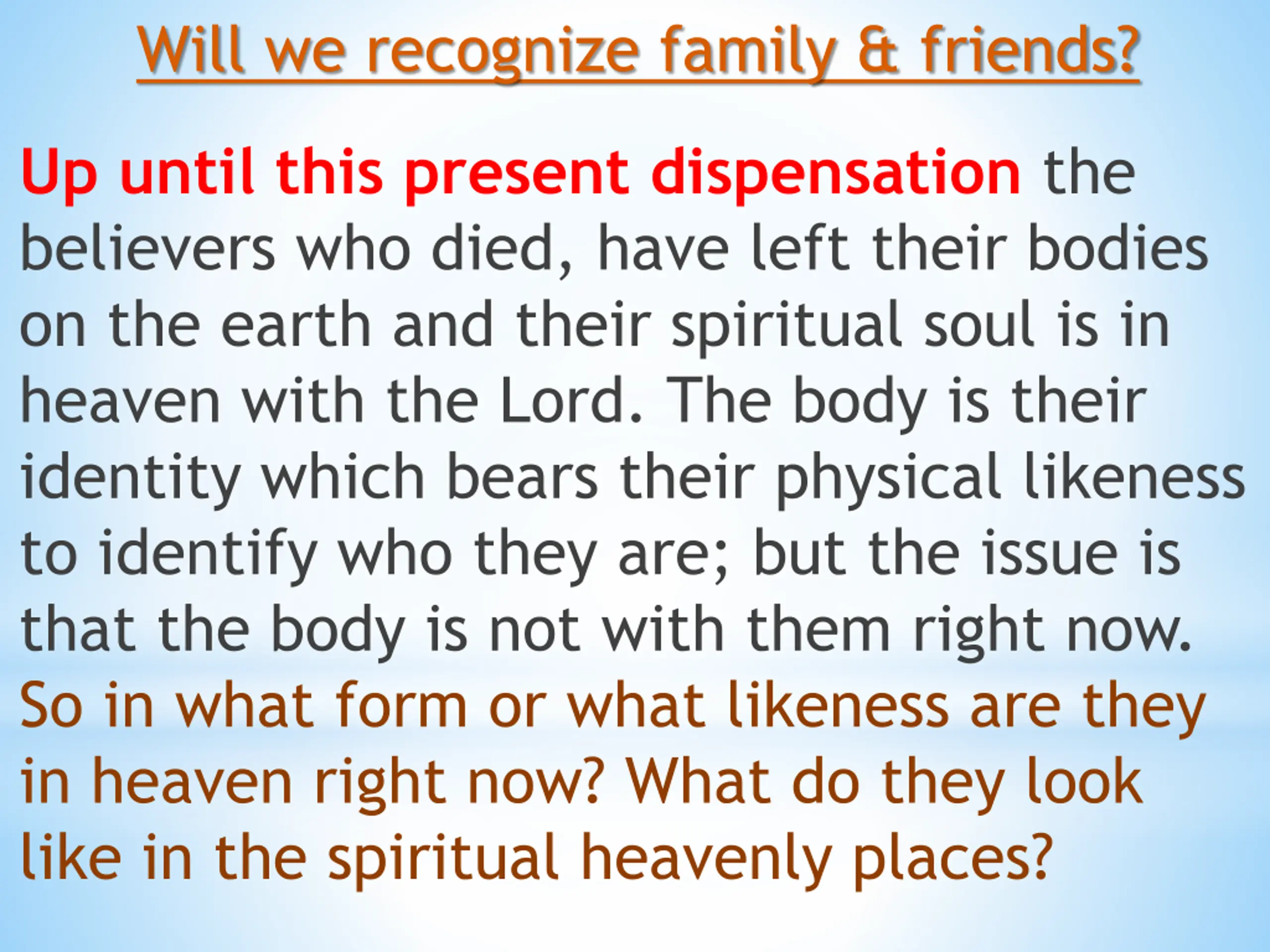 Will we recognize family & friends? Up until this present dispensation the believers who died, have left their bodies on the earth and their spiritual soul is in heaven with the Lord. The body is their identity which bears their physical likeness to identify who they are; but the issue is that the body is not with them right now. So in what form or what likeness are they in heaven right now? What do they look like in the spiritual heavenly places?
