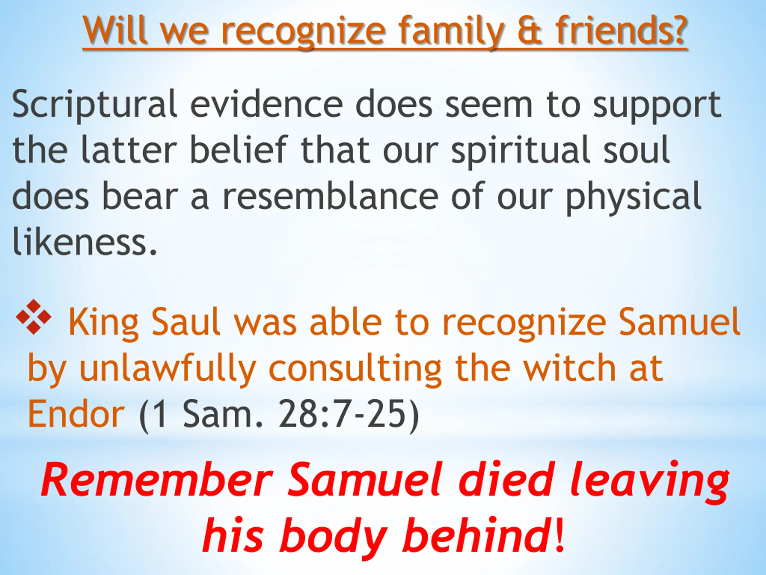 Will we recognize family & friends? Scriptural evidence does seem to support the latter belief that our spiritual soul does bear a resemblance of our physical likeness. King Saul was able to recognize Samuel by unlawfully consulting the witch at Endor (1 Sam. 28:7-25) Remember Samuel died leaving his body behind!