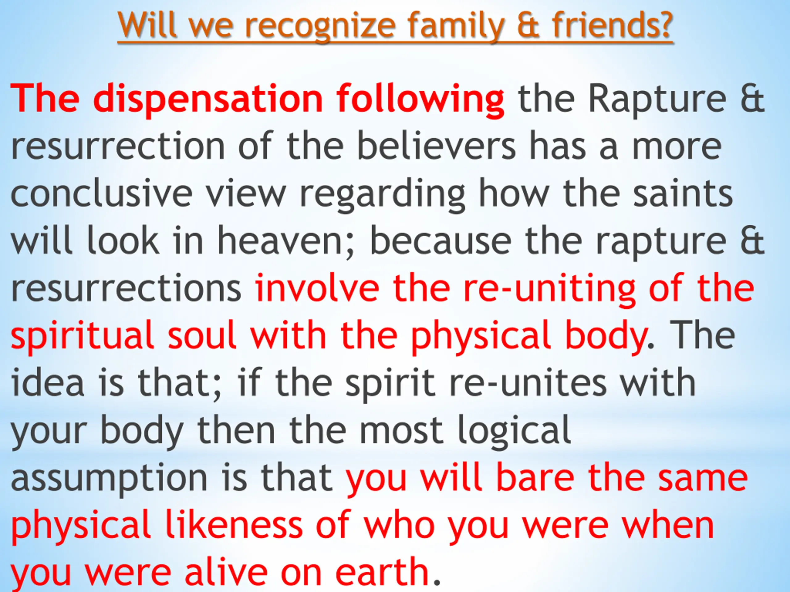 Will we recognize family & friends? The dispensation following the Rapture & resurrection of the believers has a more conclusive view regarding how the saints will look in heaven; because the rapture & resurrections involve the re-uniting of the spiritual soul with the physical body. The idea is that; if the spirit re-unites with your body then the most logical assumption is that you will bare the same physical likeness of who you were when you were alive on earth.