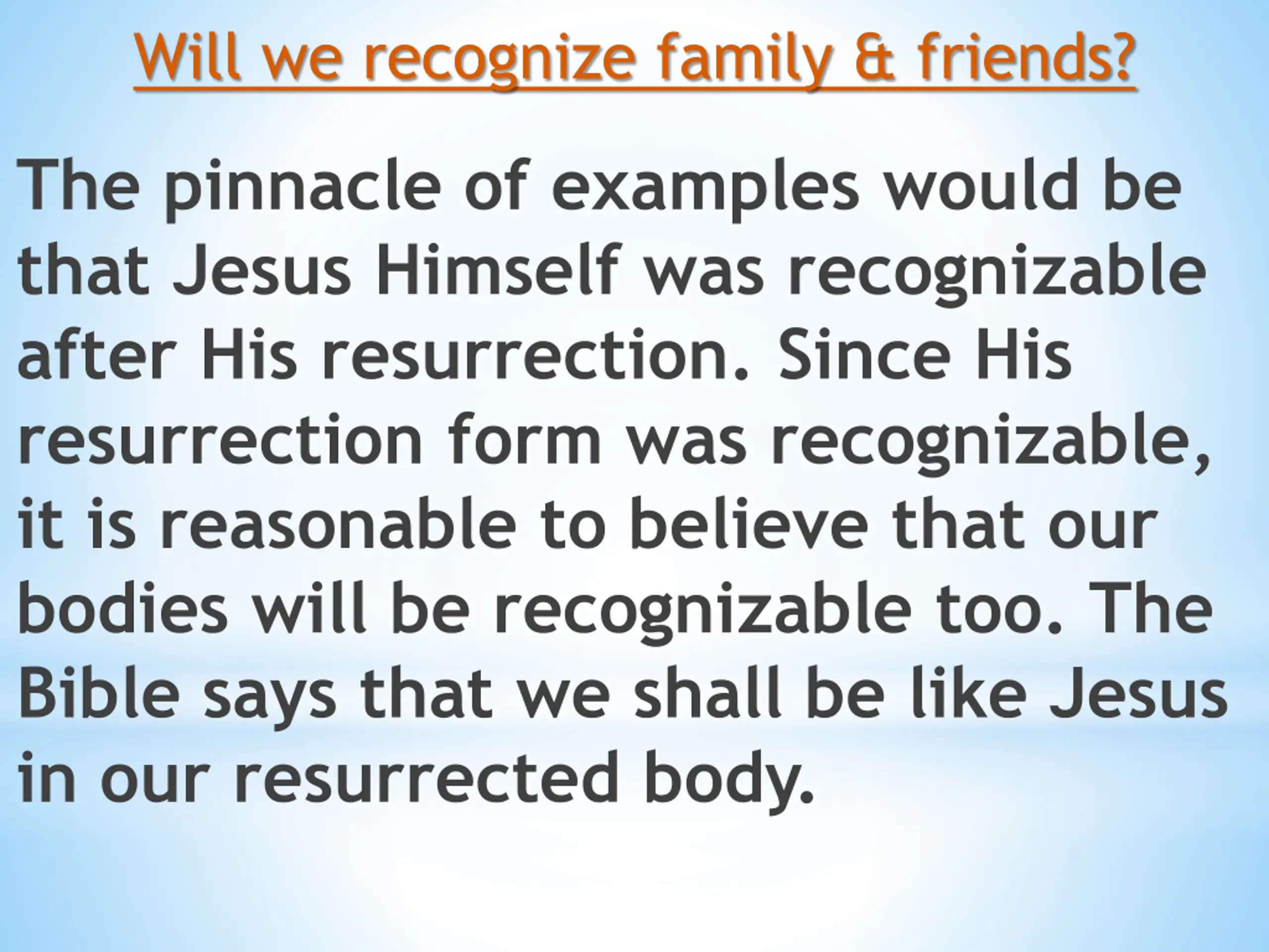 Will we recognize family & friends? The pinnacle of examples would be that Jesus Himself was recognizable after His resurrection. Since His resurrection form was recognizable, it is reasonable to believe that our bodies will be recognizable too. The Bible says that we shall be like Jesus in our resurrected body.