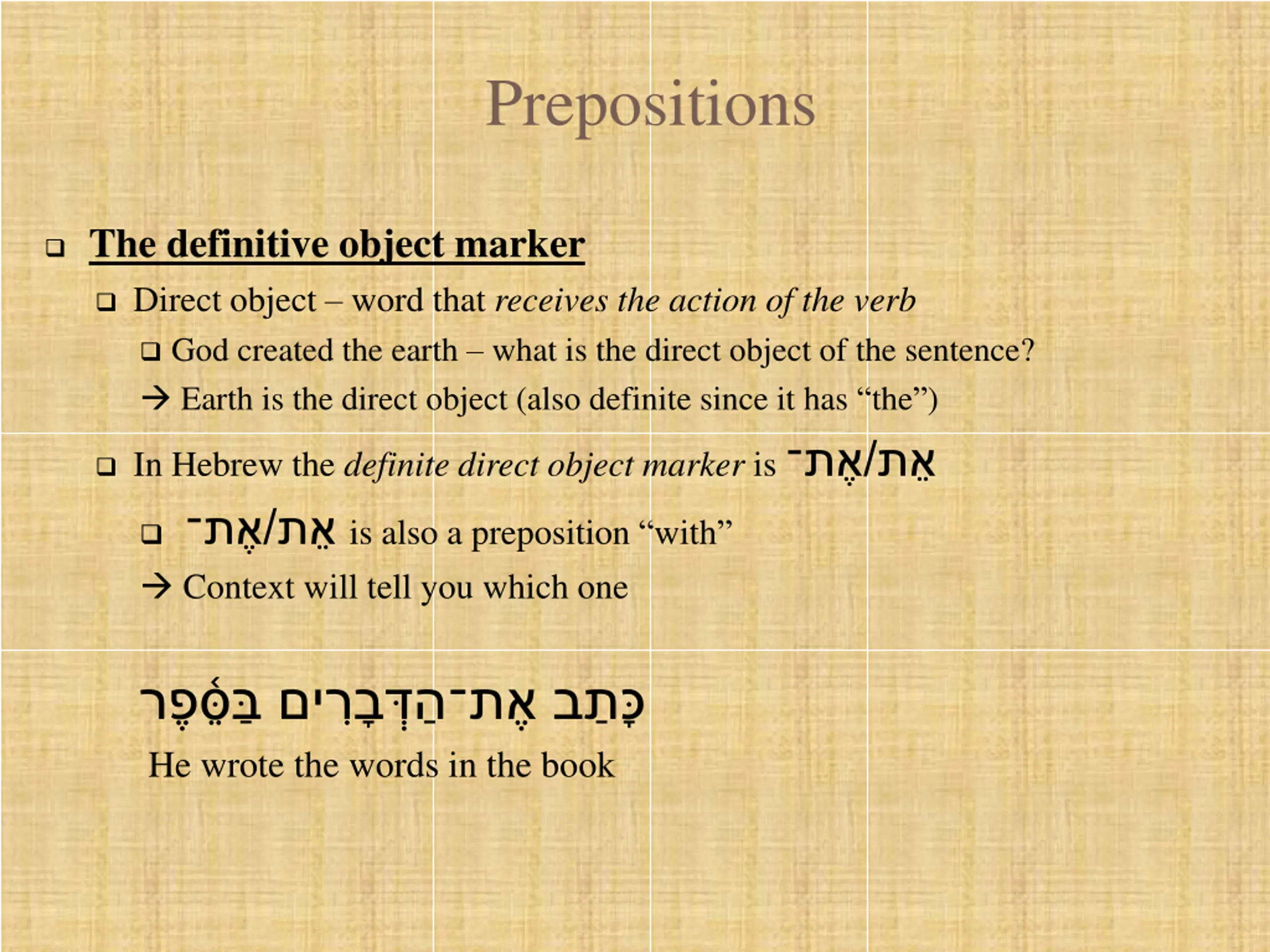 Prepositions The definitive object marker Direct object word that receives the action of the verb God created the earth what is the direct object of the sentence? Earth is the direct object (also definite since it has the ) / In Hebrew the definite direct object marker is / is also a preposition with Context will tell you which one He wrote the words in the book