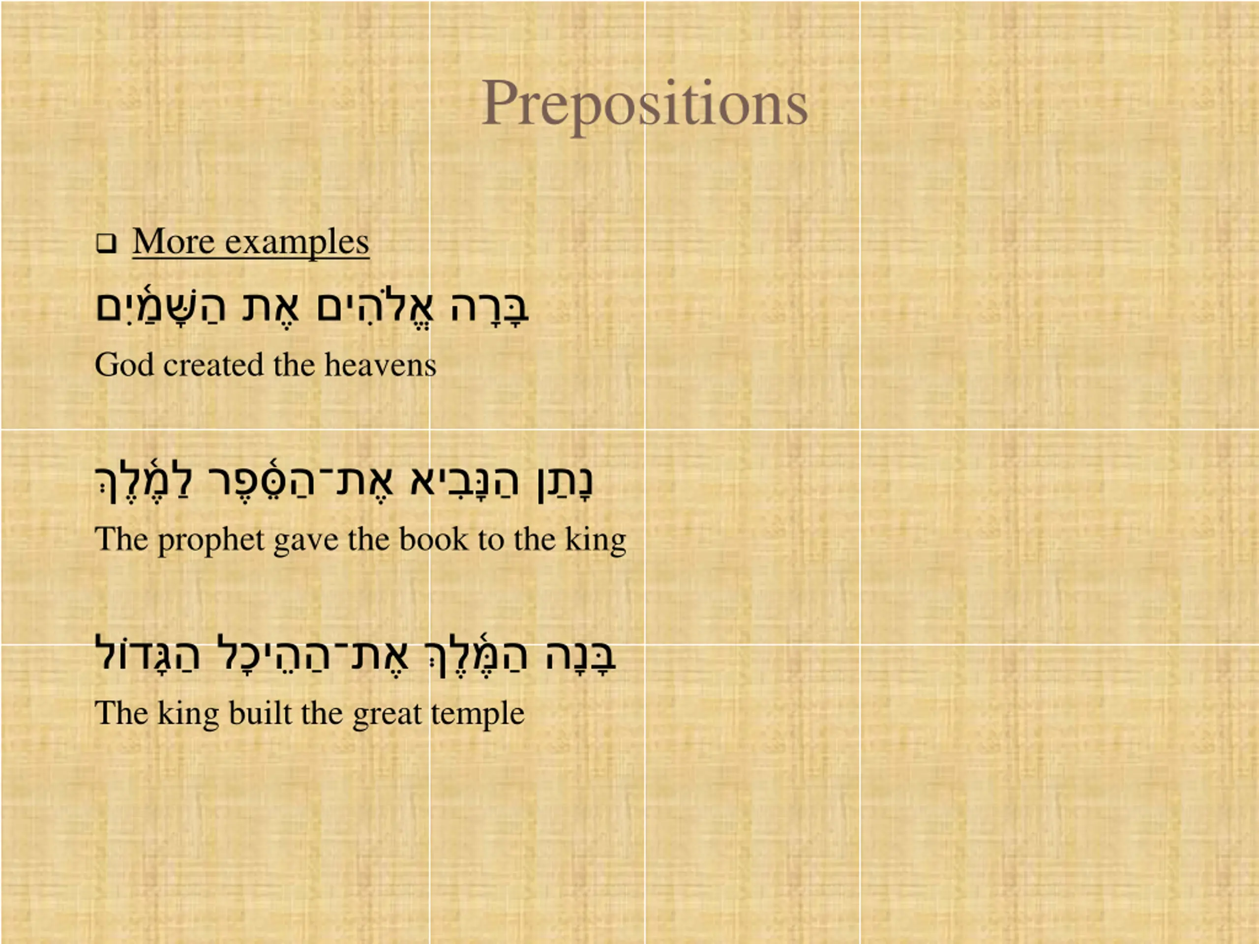 Prepositions More examples God created the heavens The prophet gave the book to the king The king built the great temple