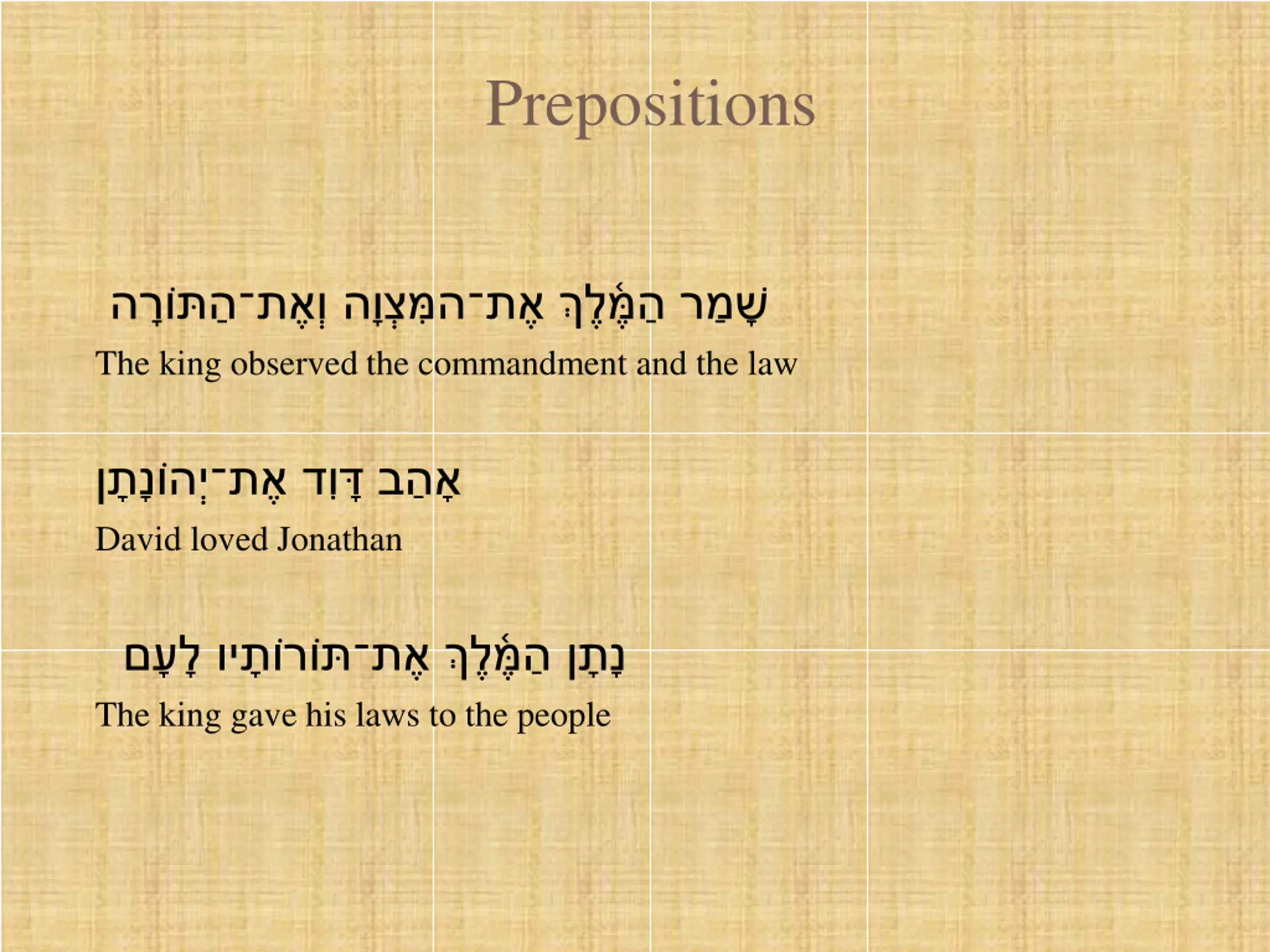 Prepositions The king observed the commandment and the law David loved Jonathan The king gave his laws to the people