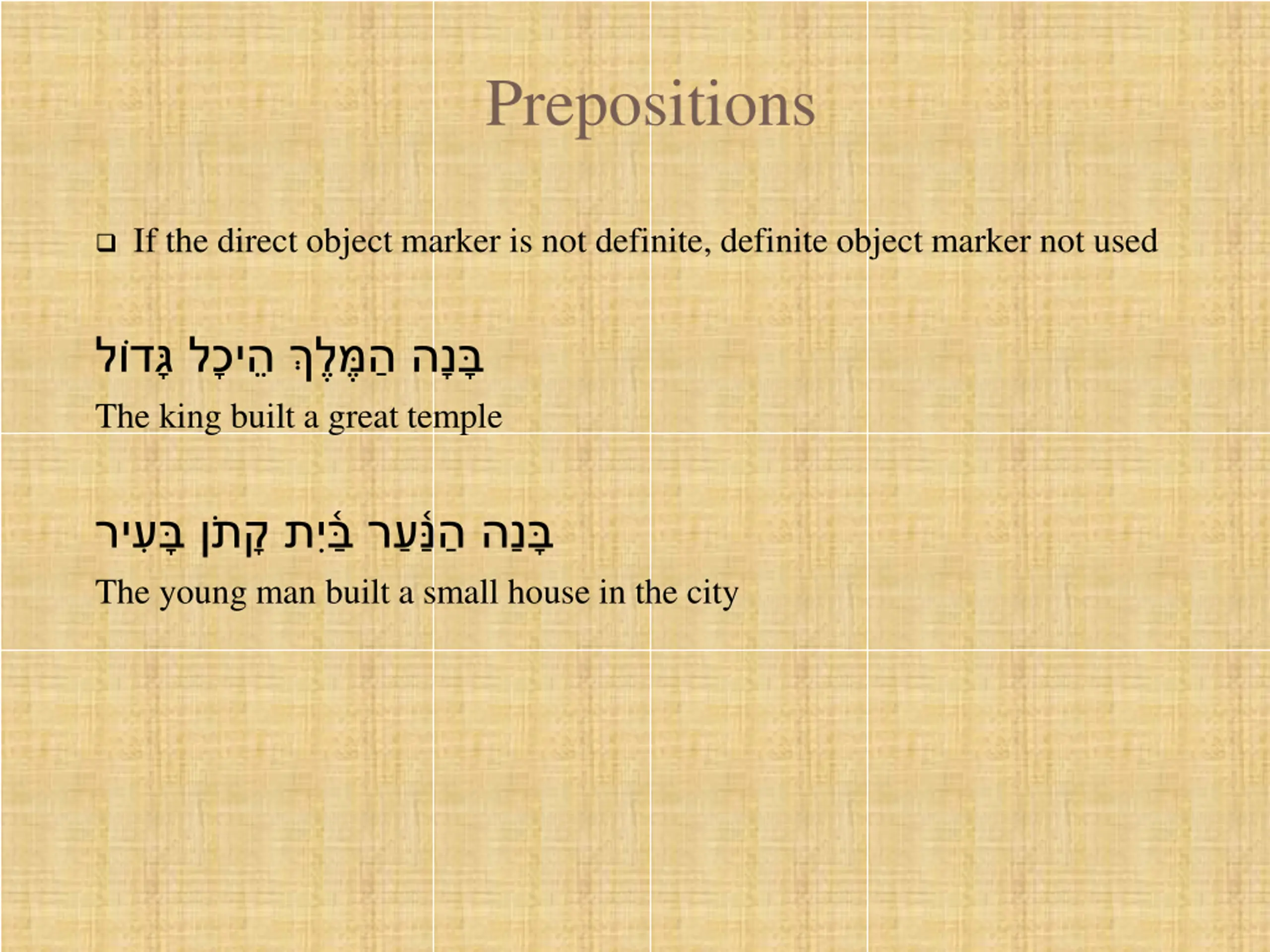 Prepositions If the direct object marker is not definite, definite object marker not used The king built a great temple The young man built a small house in the city