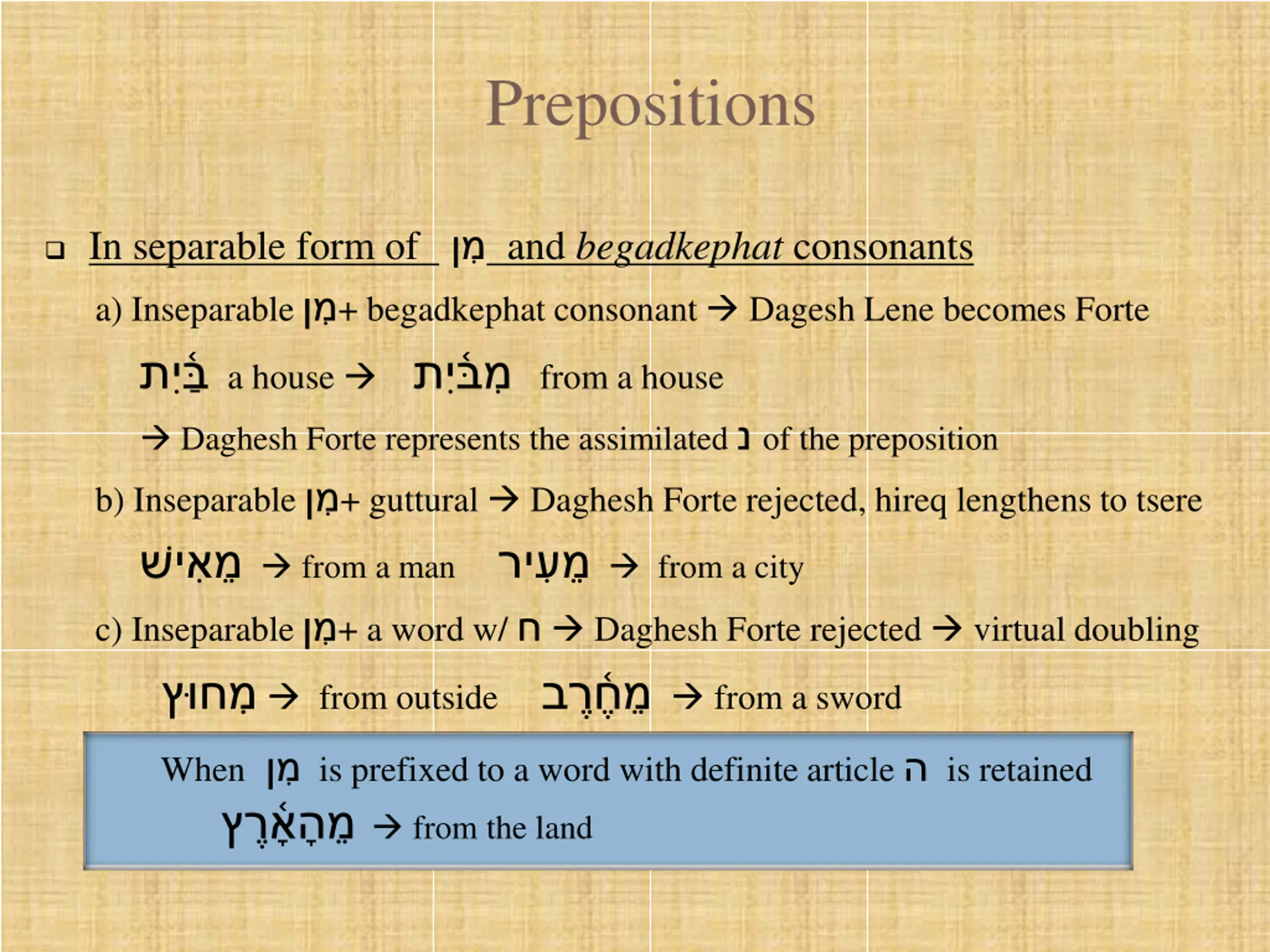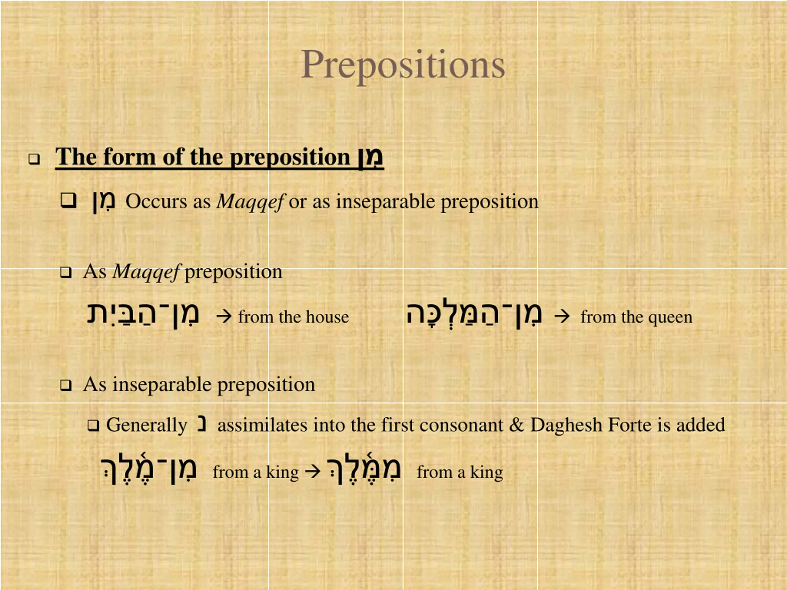 Prepositions The form of the preposition Occurs as Maqqef or as inseparable preposition As Maqqef preposition from the house from the queen As inseparable preposition Generally assimilates into the first consonant & Daghesh Forte is added from a king from a king