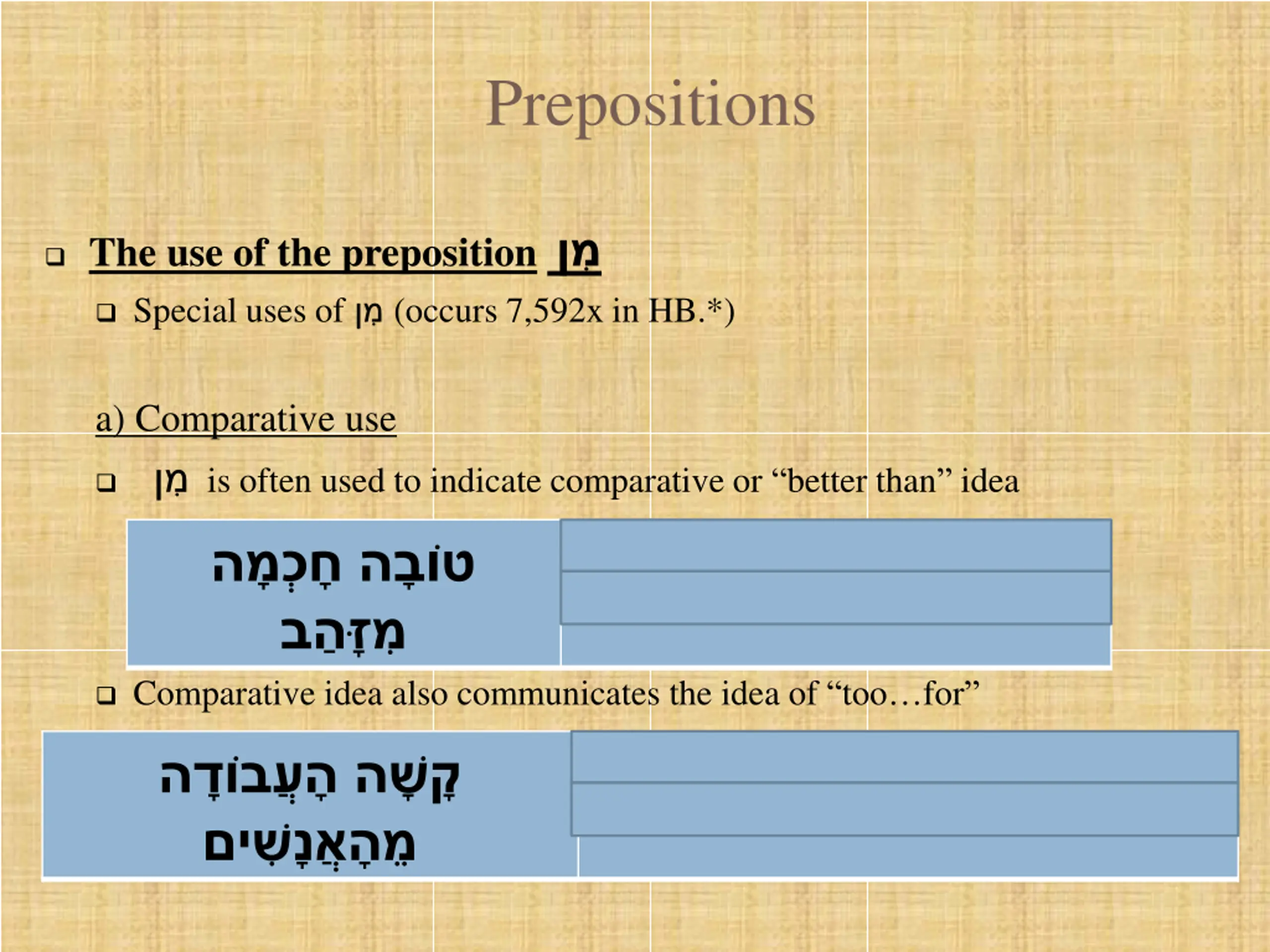 Prepositions The use of the preposition Special uses of (occurs 7,592x in HB.*) a) Comparative use is often used to indicate comparative or better than idea Literally: Wisdom is good from gold Meaning: Wisdom is better than gold Comparative idea also communicates the idea of too for Literally: The work is difficult from the men Meaning: The work is too difficult for the men