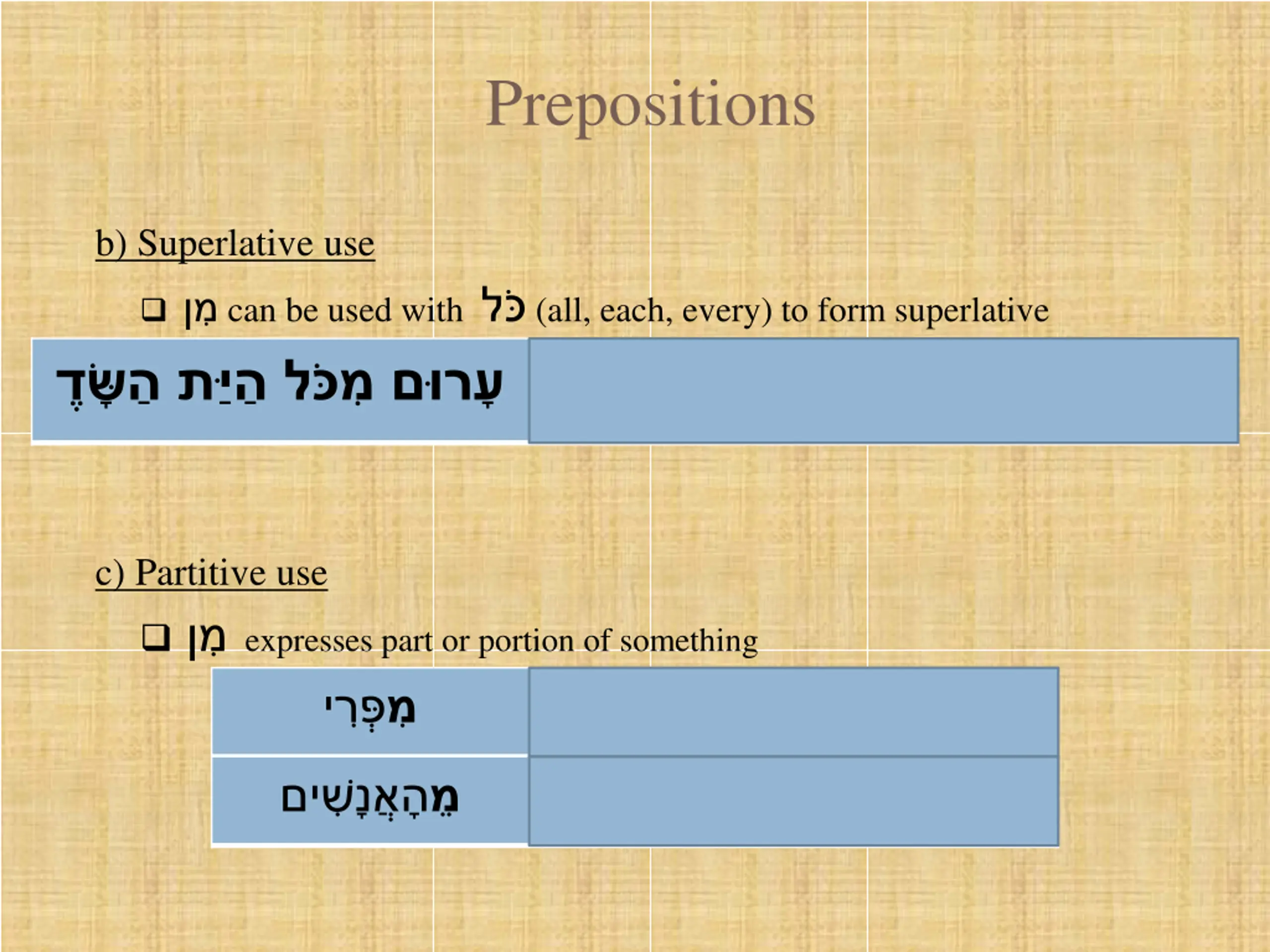 Prepositions b) Superlative use can be used with (all, each, every) to form superlative Literally: clever from every living thing of the field Superlative: the most clever living thing of the field c) Partitive use expresses part or portion of something Literally: from a fruit Partitively: some (of the) fruit Literally: from the men Partitively: some (of the) men