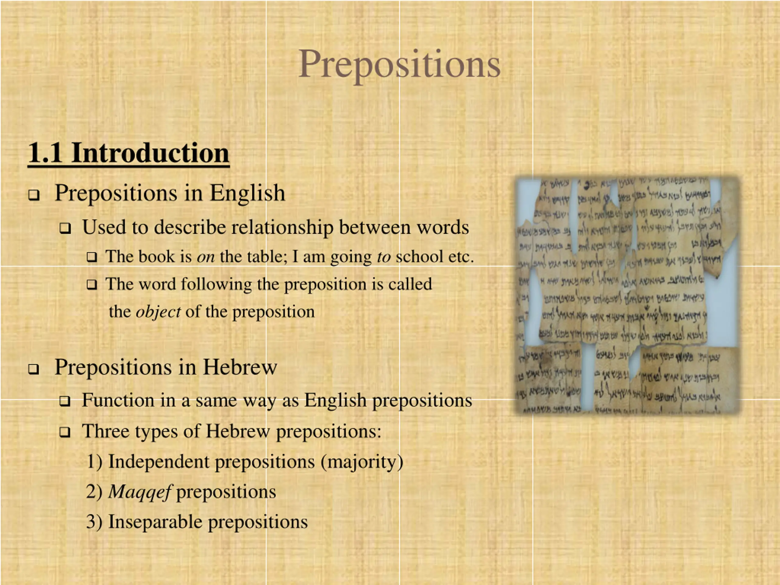 Prepositions 1.1 Introduction Prepositions in English Used to describe relationship between words The book is on the table; I am going to school etc. The word following the preposition is called the object of the preposition Prepositions in Hebrew Function in a same way as English prepositions Three types of Hebrew prepositions: 1) Independent prepositions (majority) 2) Maqqef prepositions 3) Inseparable prepositions