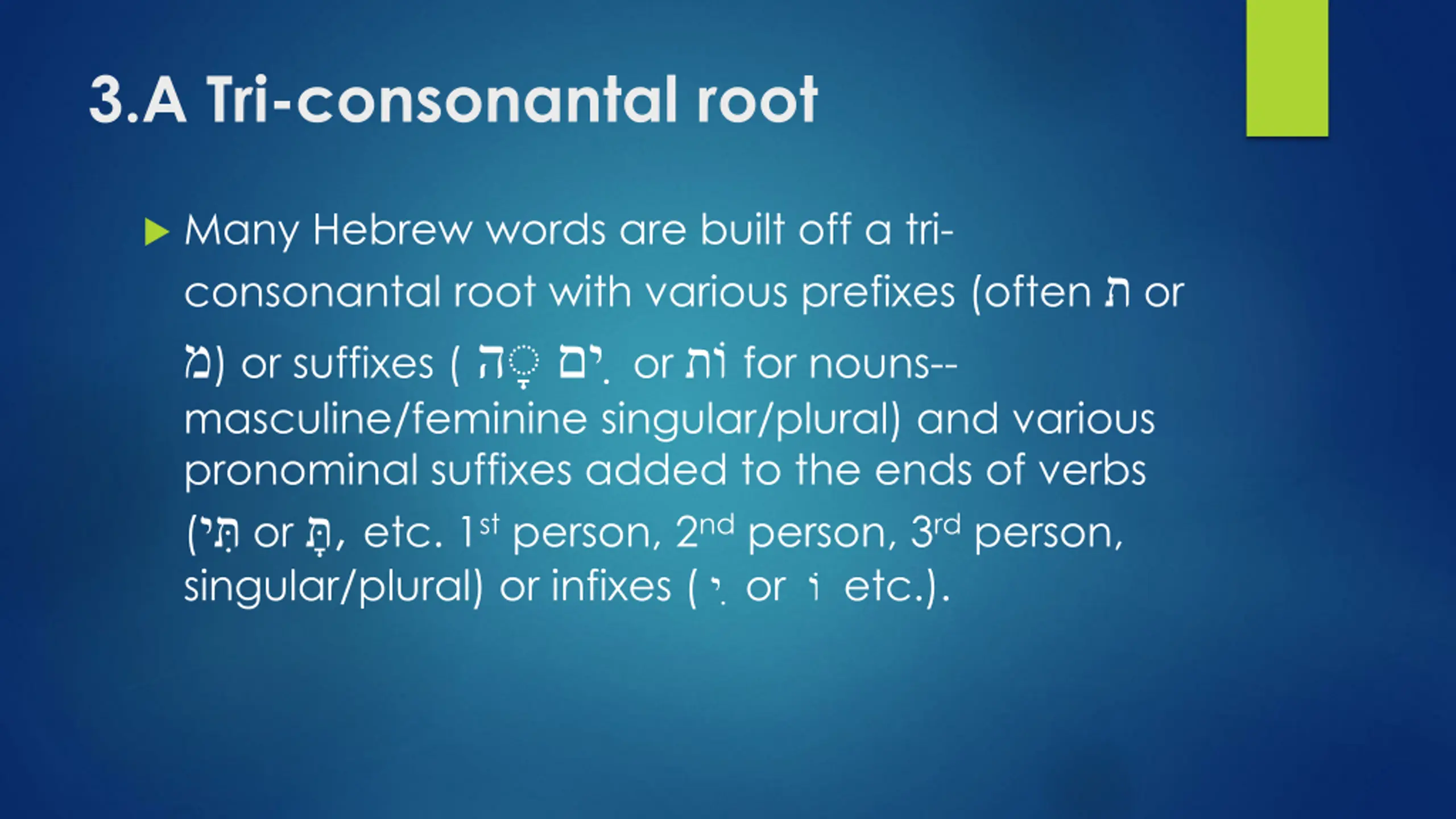3.A Tri-consonantal root Many Hebrew words are built off a tri- consonantal root with various prefixes (often ) or suffixes ( or for nouns-- masculine/feminine singular/plural) and various pronominal suffixes added to the ends of verbs ( or , etc. 1stperson, 2ndperson, 3rdperson, singular/plural) or infixes ( or etc.). or