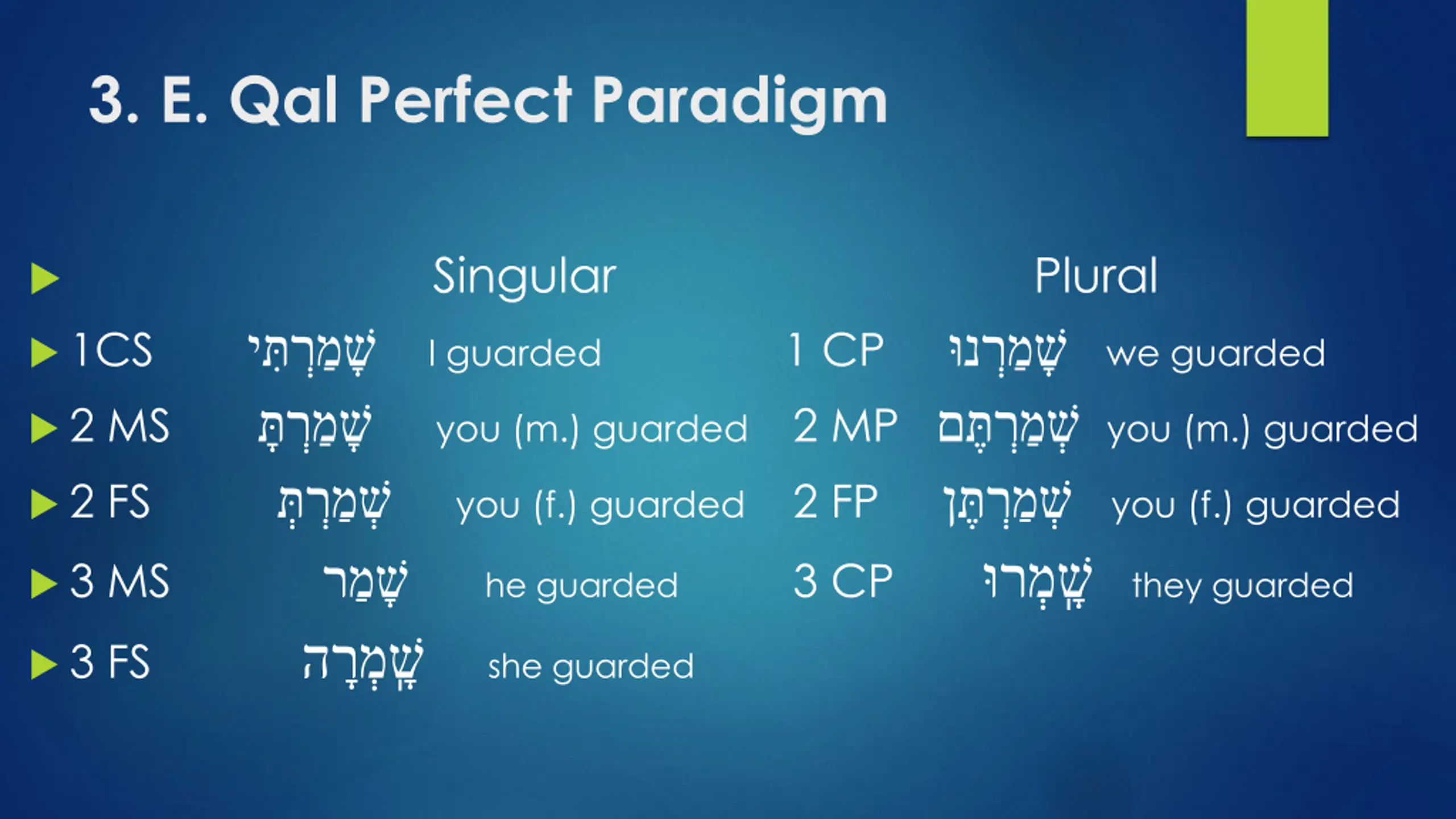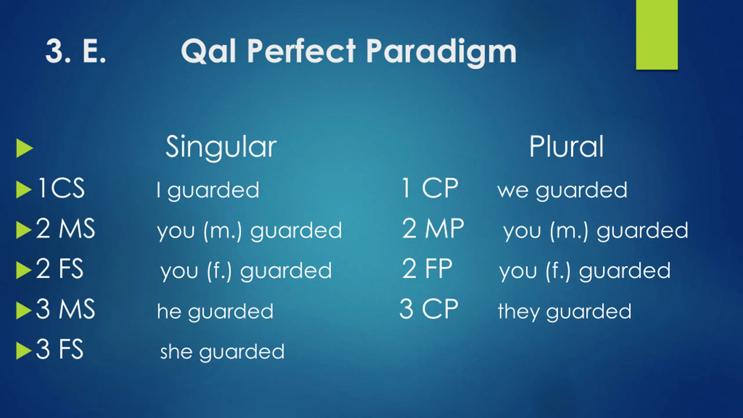 3. E. Qal Perfect Paradigm Singular Plural 1CS 2 MS 2 FS 3 MS 3 FS 1 CP 2 MP 2 FP 3 CP I guarded we guarded you (m.) guarded you (m.) guarded you (f.) guarded you (f.) guarded he guarded they guarded she guarded