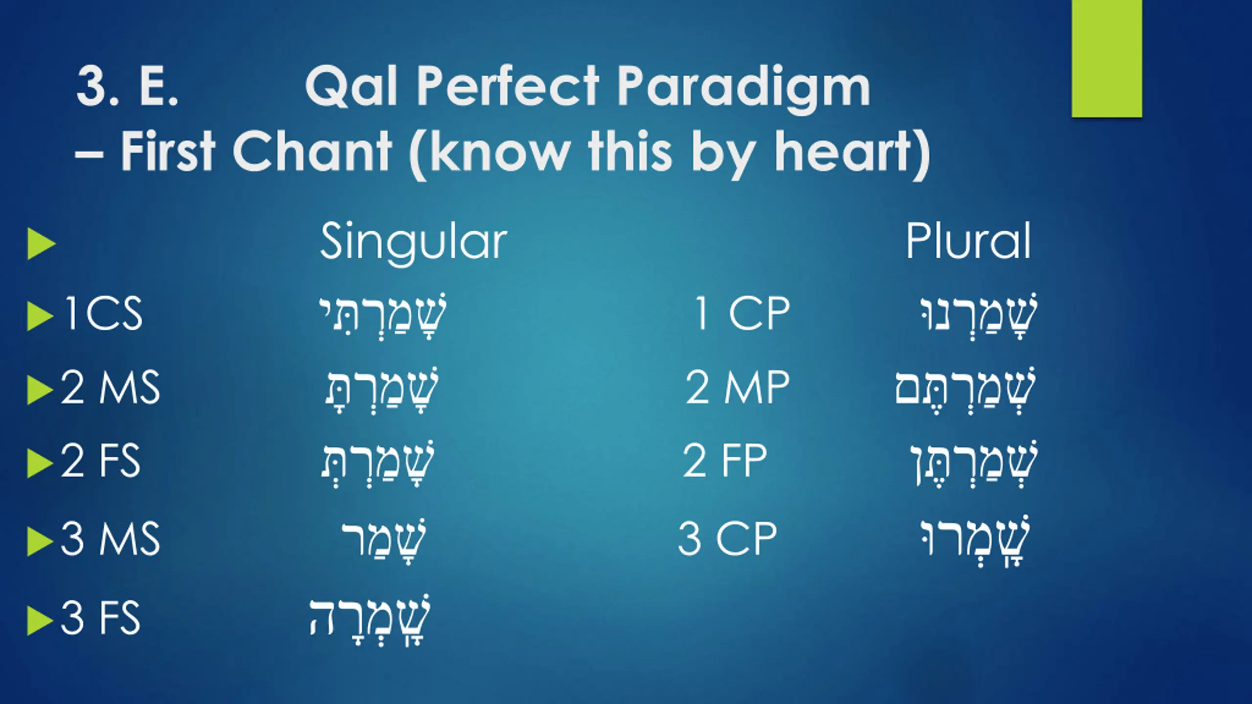 3. E. Qal Perfect Paradigm First Chant (know this by heart) Singular Plural 1CS 2 MS 2 FS 1 CP 2 MP 2 FP 3 CP 3 MS 3 FS