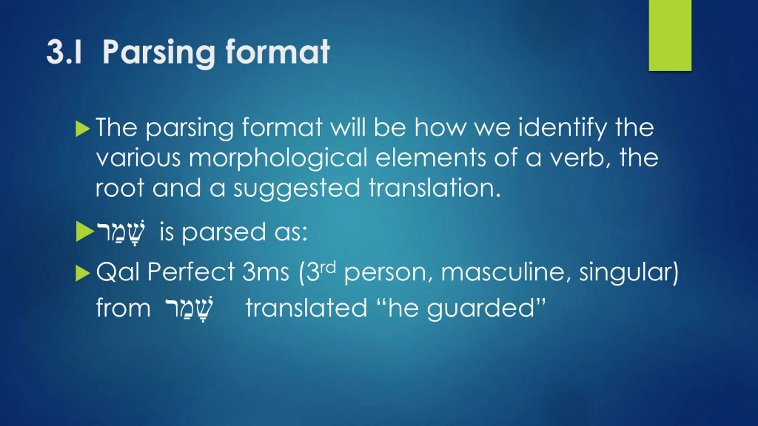 3.I Parsing format The parsing format will be how we identify the various morphological elements of a verb, the root and a suggested translation. is parsed as: Qal Perfect 3ms (3rdperson, masculine, singular) from translated he guarded