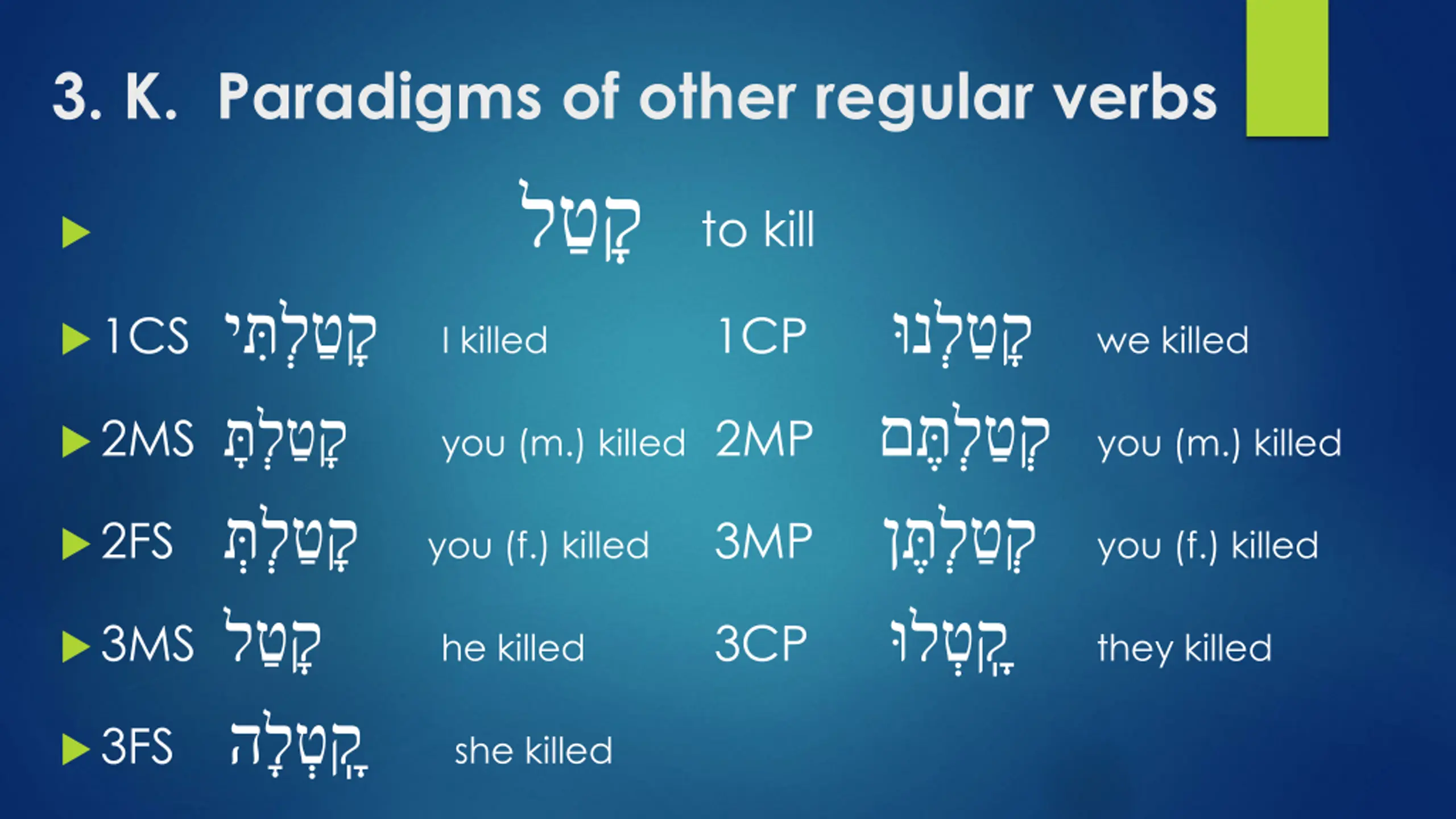 3. K. Paradigms of other regular verbs to kill 1CS 1CP I killed we killed you (m.) killed 2MP 3MP 3CP 2MS you (m.) killed 2FS you (f.) killed you (f.) killed 3MS he killed they killed 3FS she killed