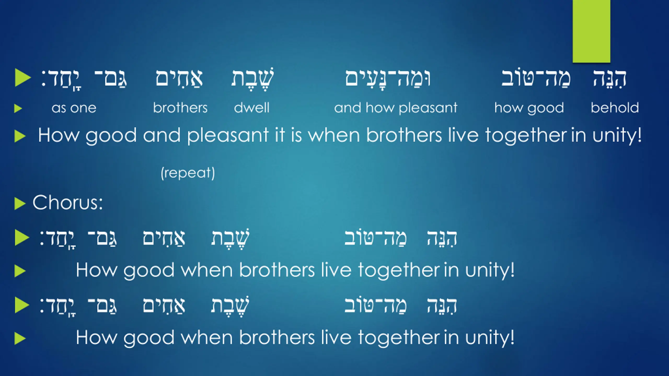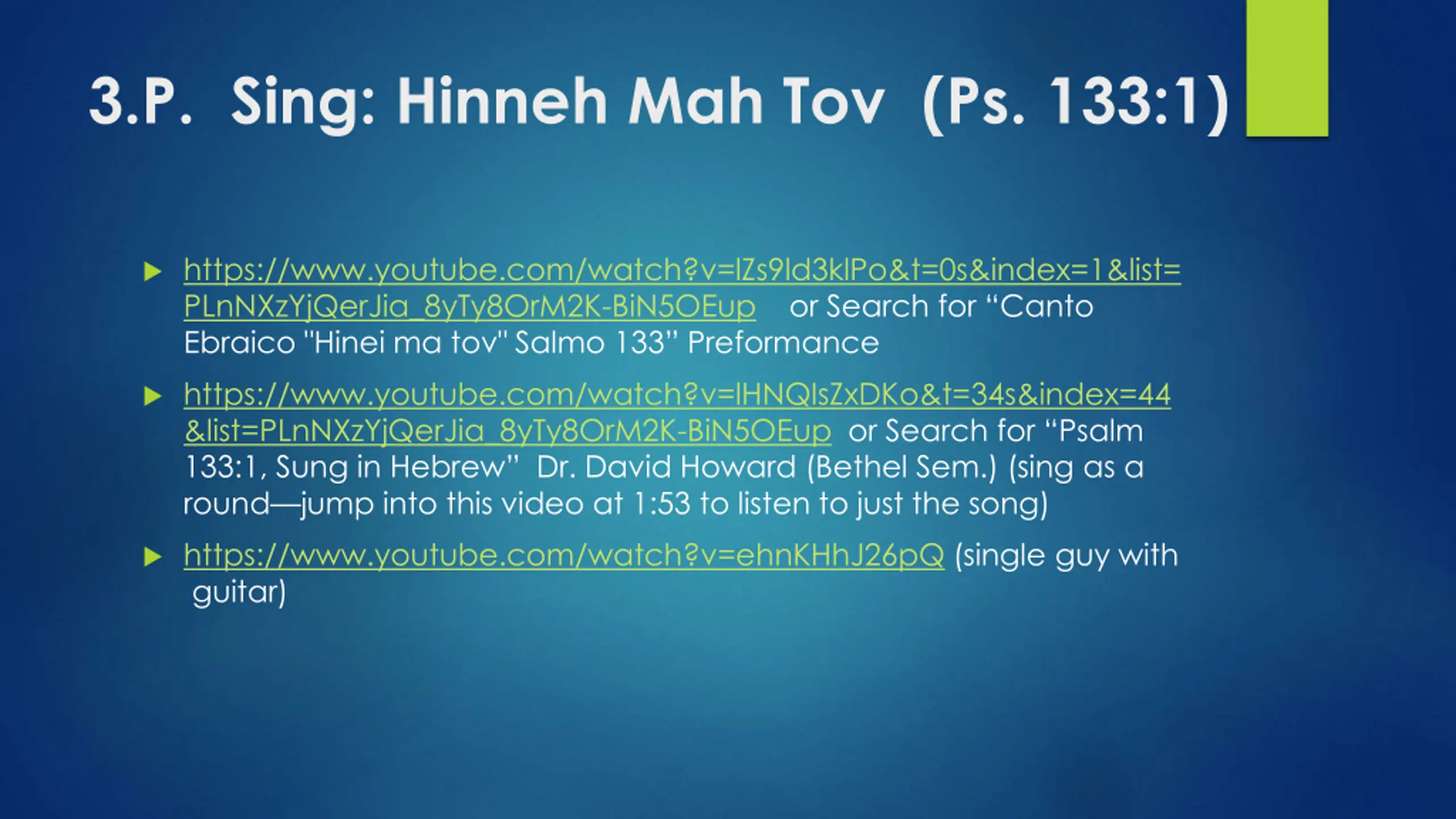 3.P. Sing: Hinneh Mah Tov (Ps. 133:1) https://www.youtube.com/watch?v=lZs9ld3klPo&t=0s&index=1&list= PLnNXzYjQerJia_8yTy8OrM2K-BiN5OEup Ebraico "Hinei ma tov" Salmo 133 Preformance or Search for Canto https://www.youtube.com/watch?v=lHNQIsZxDKo&t=34s&index=44 &list=PLnNXzYjQerJia_8yTy8OrM2K-BiN5OEup or Search for Psalm 133:1, Sung in Hebrew Dr. David Howard (Bethel Sem.) (sing as a round jump into this video at 1:53 to listen to just the song) https://www.youtube.com/watch?v=ehnKHhJ26pQ (single guy with guitar)