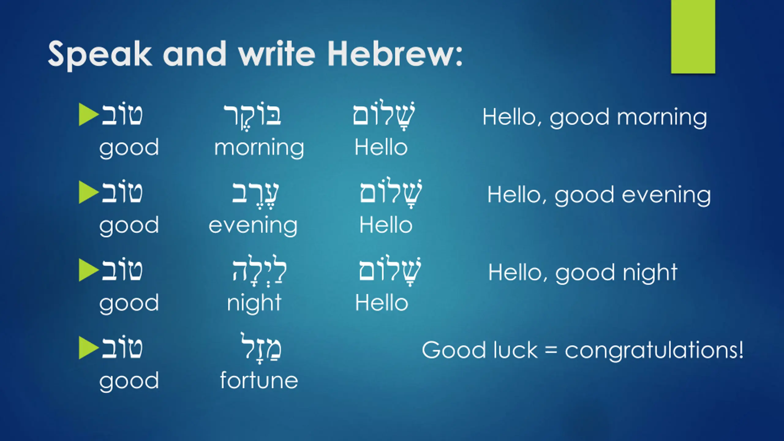Speak and write Hebrew: good morning good evening good night good fortune Hello, good morning Hello Hello, good evening Hello Hello, good night Hello Good luck = congratulations!