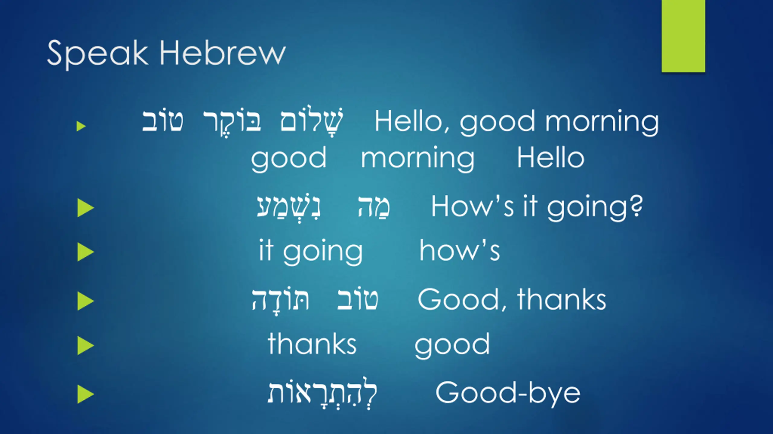 Speak Hebrew Hello, good morning good morning Hello How s it going? it going how s Good, thanks thanks good Good-bye