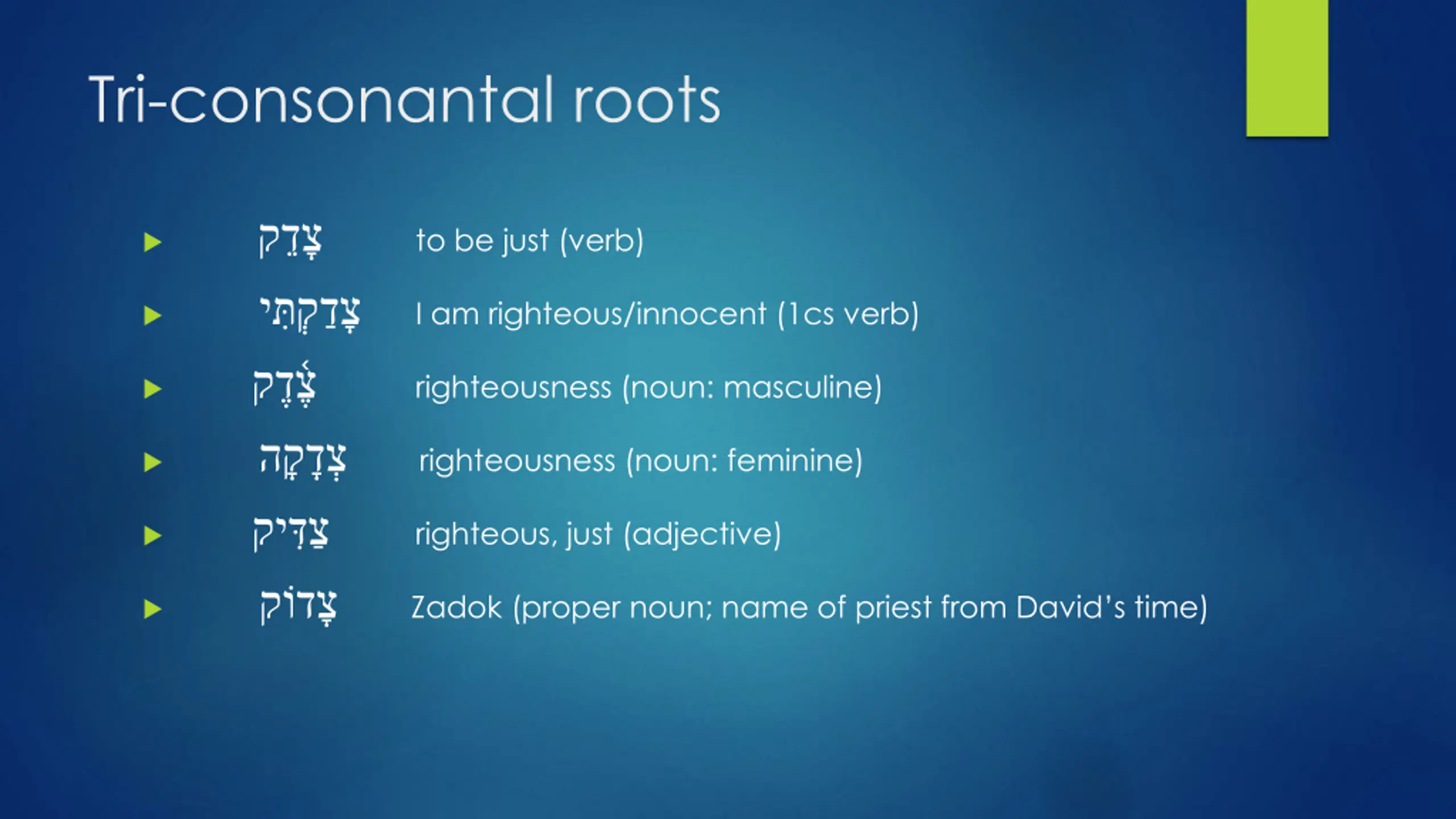 Tri-consonantal roots to be just (verb) I am righteous/innocent (1cs verb) righteousness (noun: masculine) righteousness (noun: feminine) righteous, just (adjective) Zadok (proper noun; name of priest from David s time)
