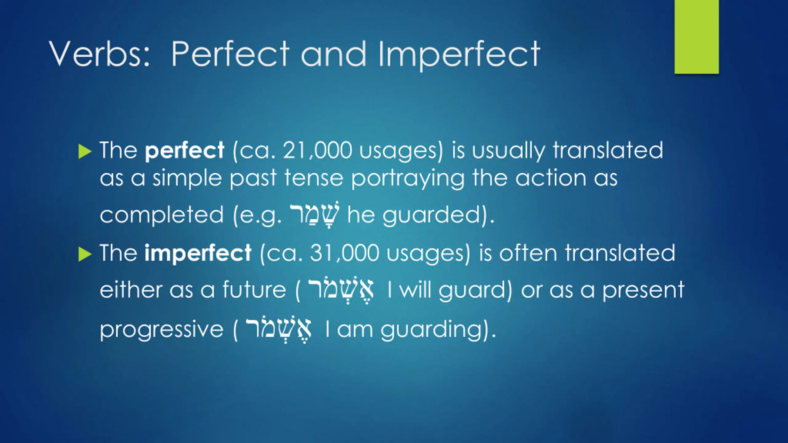 Verbs: Perfect and Imperfect The perfect (ca. 21,000 usages) is usually translated as a simple past tense portraying the action as completed (e.g. he guarded). The imperfect (ca. 31,000 usages) is often translated either as a future ( I will guard) or as a present progressive ( I am guarding).