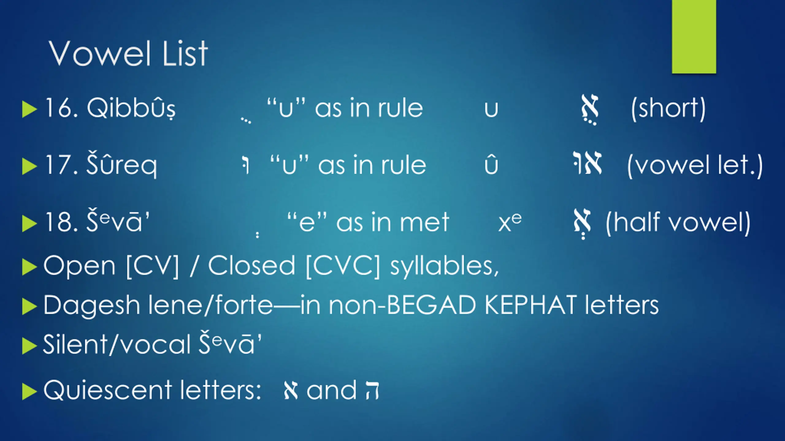 Vowel List (vowel let.) (half vowel) 16. Qibb u as in rule u (short) u as in rule 17. req 18. ev e as in met xe Open [CV] / Closed [CVC] syllables, Dagesh lene/forte in non-BEGAD KEPHAT letters Silent/vocal ev Quiescent letters: and