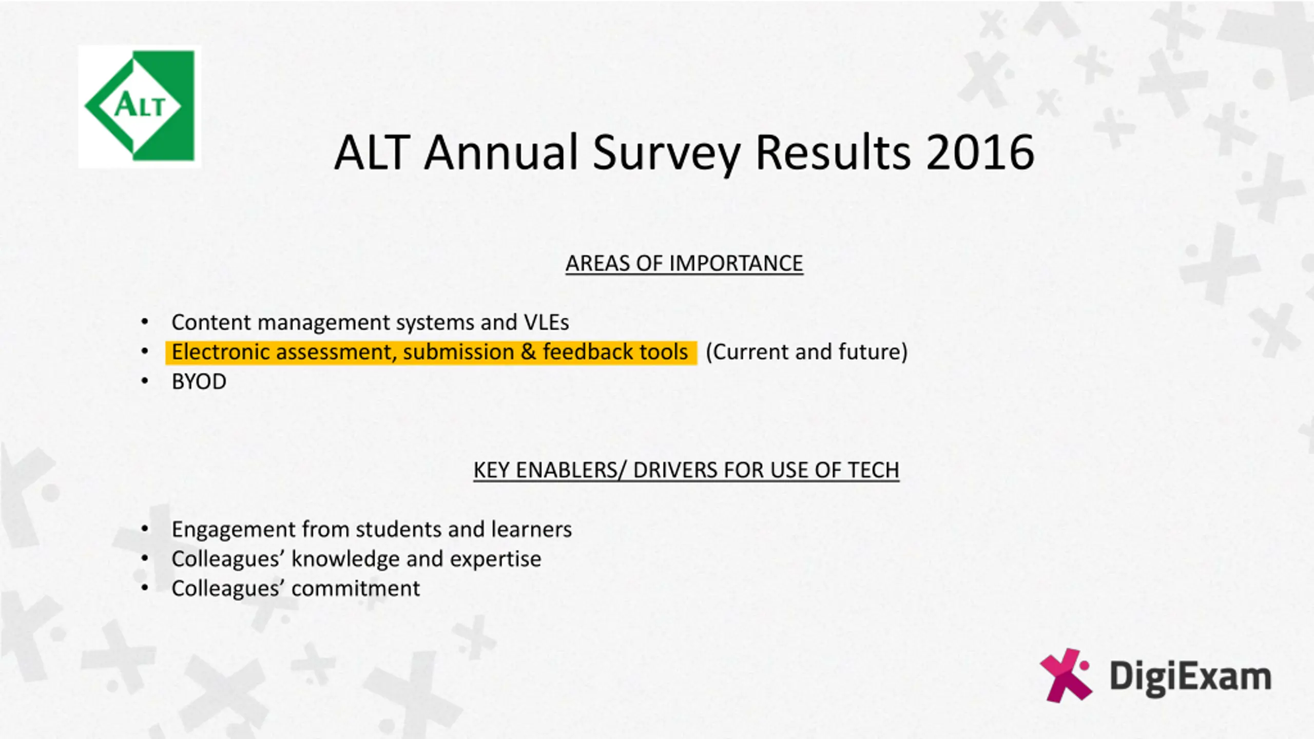 ALT Annual Survey Results 2016 AREAS OF IMPORTANCE Content management systems and VLEs Electronic assessment, submission & feedback tools (Current and future) BYOD KEY ENABLERS/ DRIVERS FOR USE OF TECH Engagement from students and learners Colleagues knowledge and expertise Colleagues commitment
