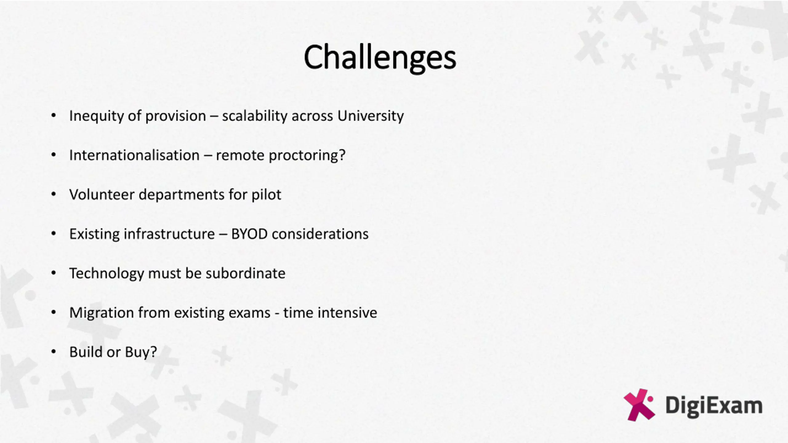 Challenges Challenges Inequity of provision scalability across University Internationalisation remote proctoring? Volunteer departments for pilot Existing infrastructure BYOD considerations Technology must be subordinate Migration from existing exams - time intensive Build or Buy?
