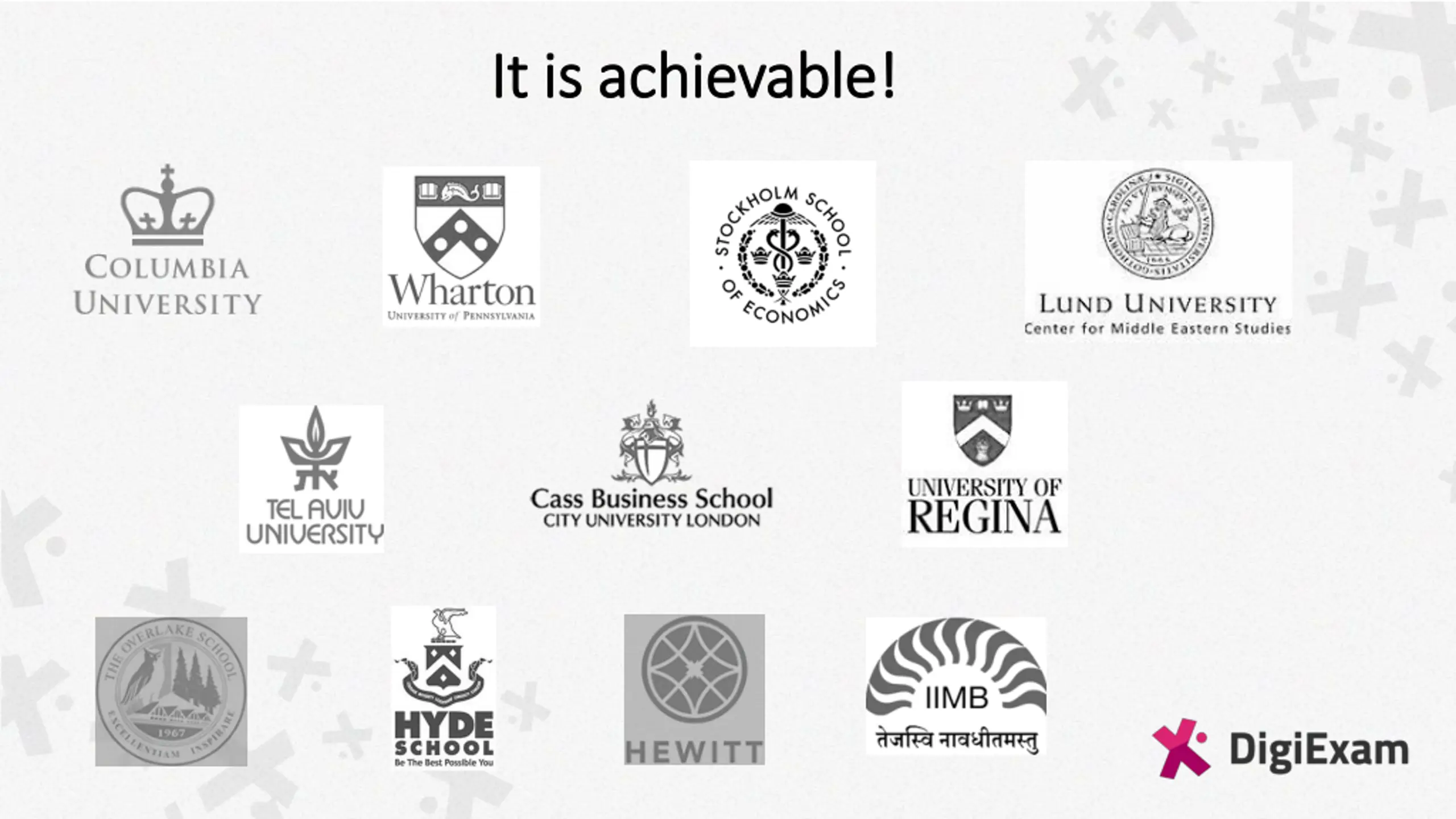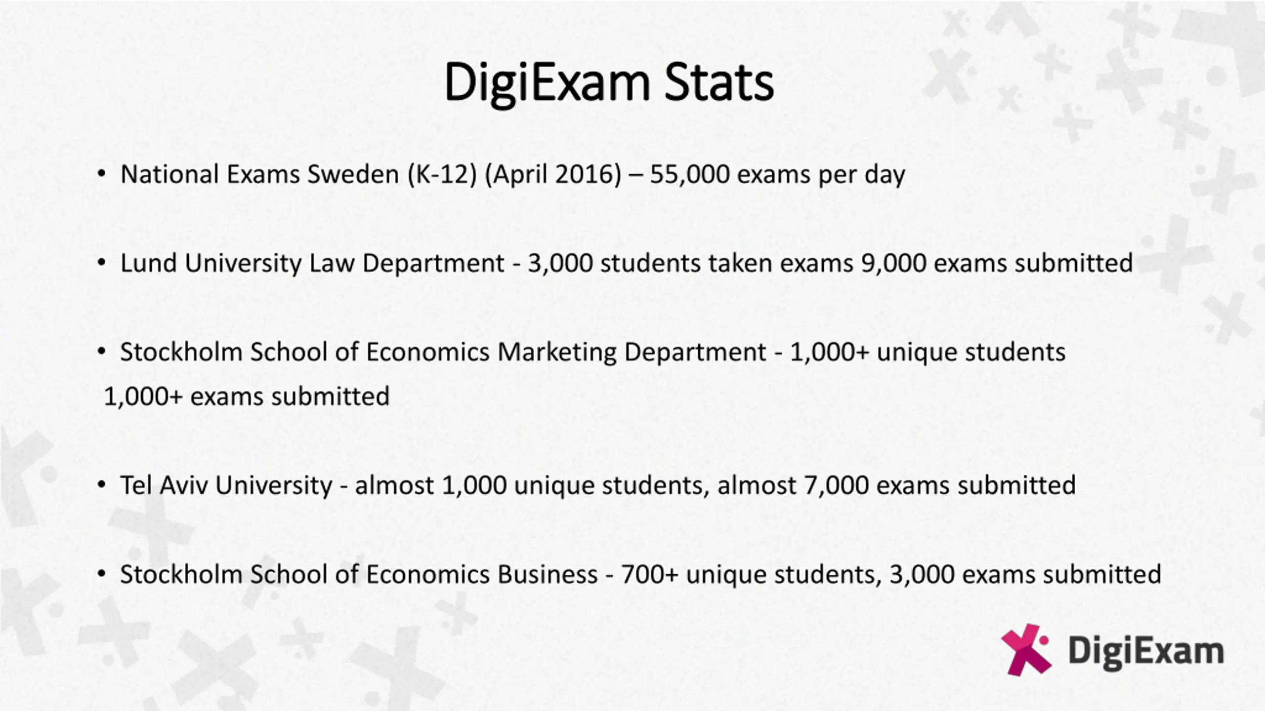 DigiExam DigiExam Stats Stats National Exams Sweden (K-12) (April 2016) 55,000 exams per day Lund University Law Department - 3,000 students taken exams 9,000 exams submitted Stockholm School of Economics Marketing Department - 1,000+ unique students 1,000+ exams submitted Tel Aviv University - almost 1,000 unique students, almost 7,000 exams submitted Stockholm School of Economics Business - 700+ unique students, 3,000 exams submitted