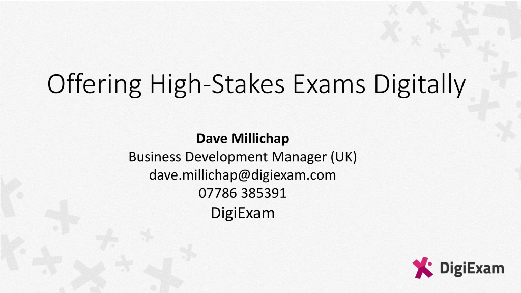 Offering High-Stakes Exams Digitally Dave Millichap Business Development Manager (UK) dave.millichap@digiexam.com 07786 385391 DigiExam