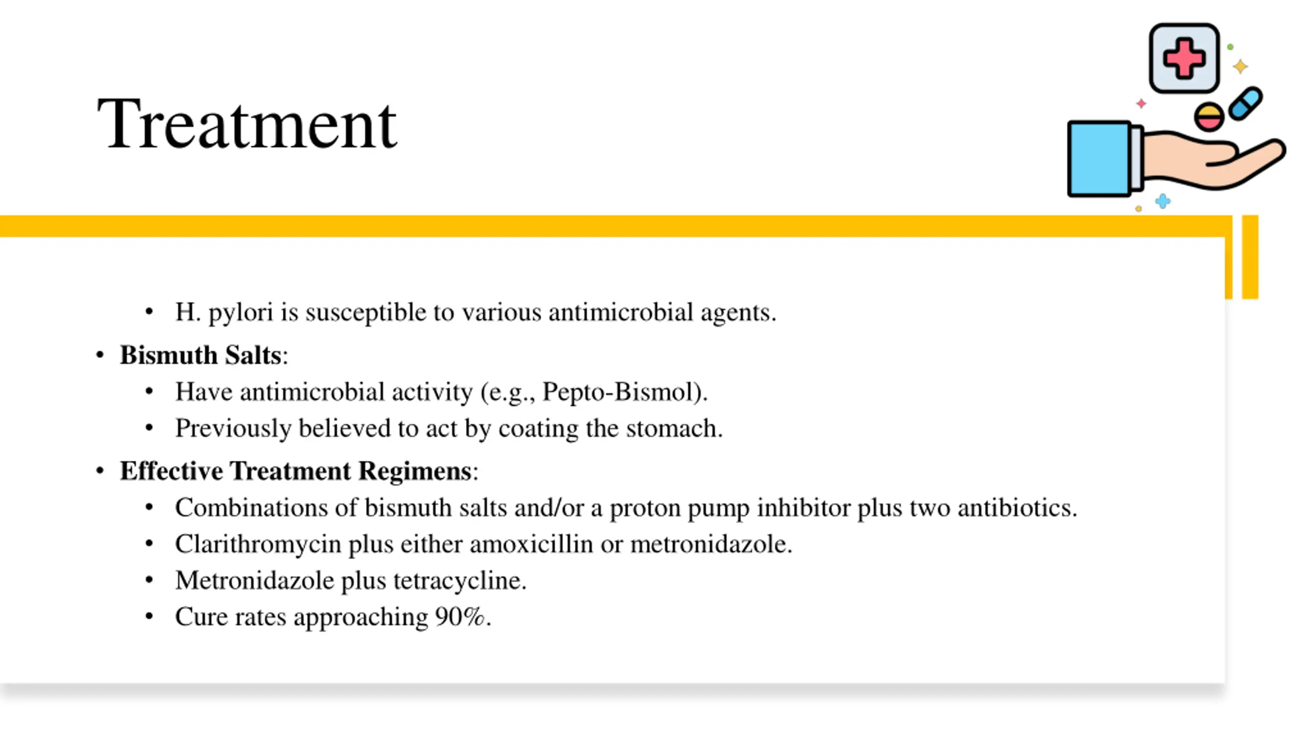 Treatment H. pylori is susceptible to various antimicrobial agents. Bismuth Salts: Have antimicrobial activity (e.g., Pepto-Bismol). Previously believed to act by coating the stomach. Effective Treatment Regimens: Combinations of bismuth salts and/or a proton pump inhibitor plus two antibiotics. Clarithromycin plus either amoxicillin or metronidazole. Metronidazole plus tetracycline. Cure rates approaching 90%.