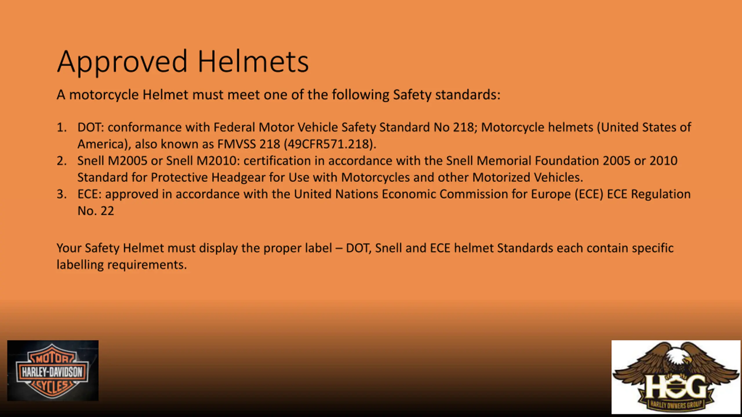 Approved Helmets A motorcycle Helmet must meet one of the following Safety standards: 1. DOT: conformance with Federal Motor Vehicle Safety Standard No 218; Motorcycle helmets (United States of America), also known as FMVSS 218 (49CFR571.218). 2. Snell M2005 or Snell M2010: certification in accordance with the Snell Memorial Foundation 2005 or 2010 Standard for Protective Headgear for Use with Motorcycles and other Motorized Vehicles. 3. ECE: approved in accordance with the United Nations Economic Commission for Europe (ECE) ECE Regulation No. 22 Your Safety Helmet must display the proper label DOT, Snell and ECE helmet Standards each contain specific labelling requirements.