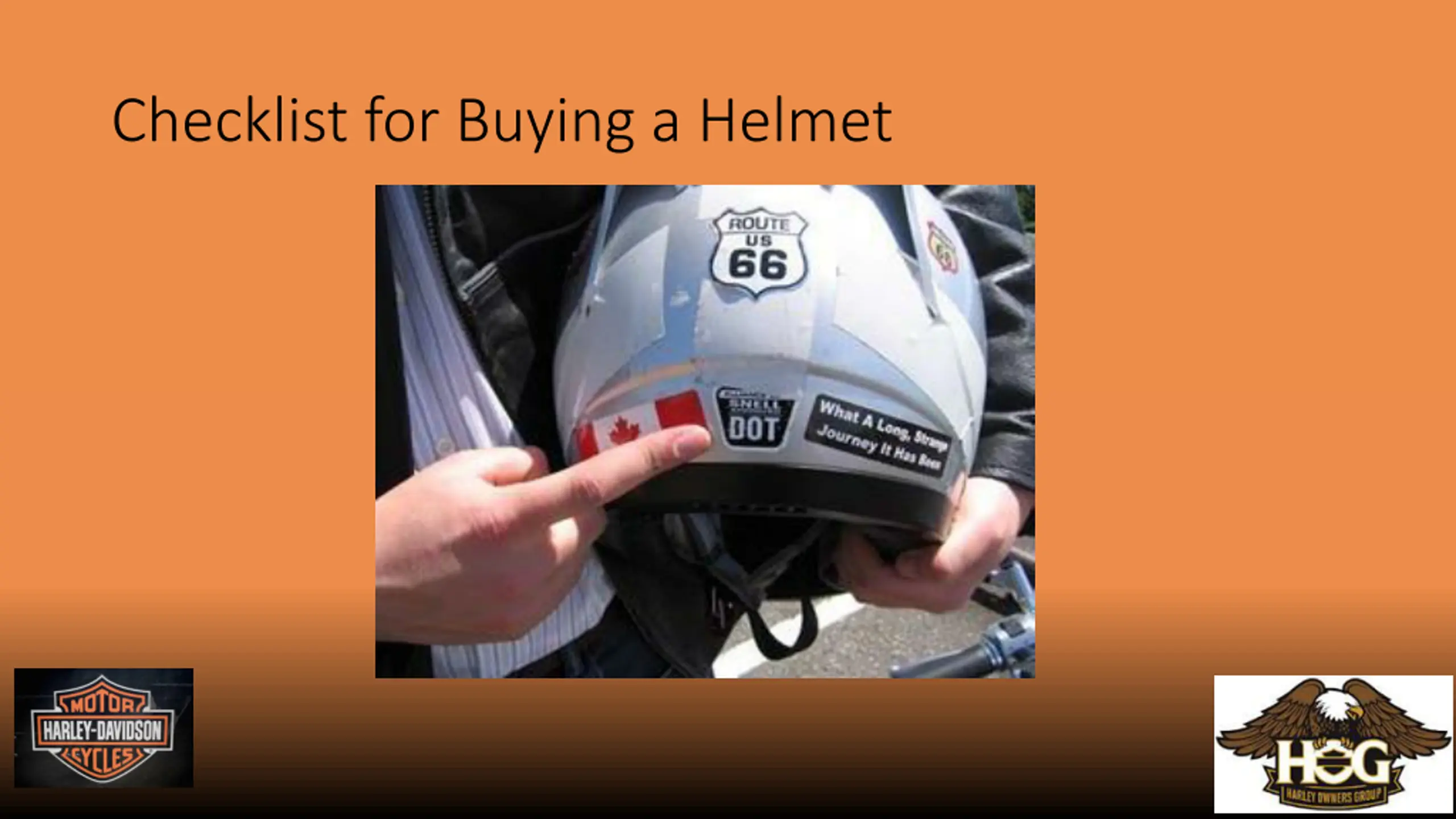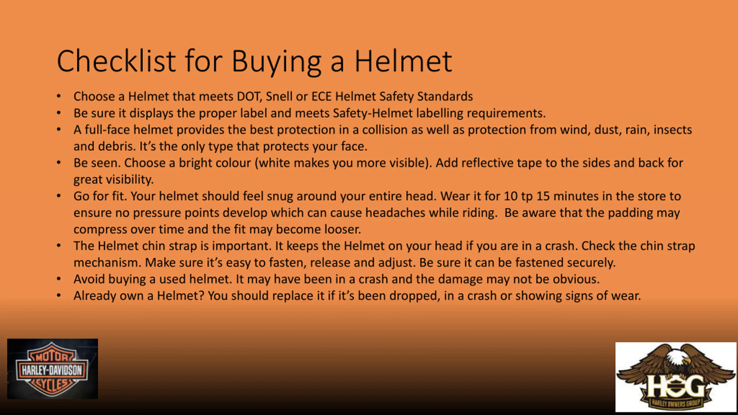 Checklist for Buying a Helmet Choose a Helmet that meets DOT, Snell or ECE Helmet Safety Standards Be sure it displays the proper label and meets Safety-Helmet labelling requirements. A full-face helmet provides the best protection in a collision as well as protection from wind, dust, rain, insects and debris. It s the only type that protects your face. Be seen. Choose a bright colour (white makes you more visible). Add reflective tape to the sides and back for great visibility. Go for fit. Your helmet should feel snug around your entire head. Wear it for 10 tp 15 minutes in the store to ensure no pressure points develop which can cause headaches while riding. Be aware that the padding may compress over time and the fit may become looser. The Helmet chin strap is important. It keeps the Helmet on your head if you are in a crash. Check the chin strap mechanism. Make sure it s easy to fasten, release and adjust. Be sure it can be fastened securely. Avoid buying a used helmet. It may have been in a crash and the damage may not be obvious. Already own a Helmet? You should replace it if it s been dropped, in a crash or showing signs of wear.