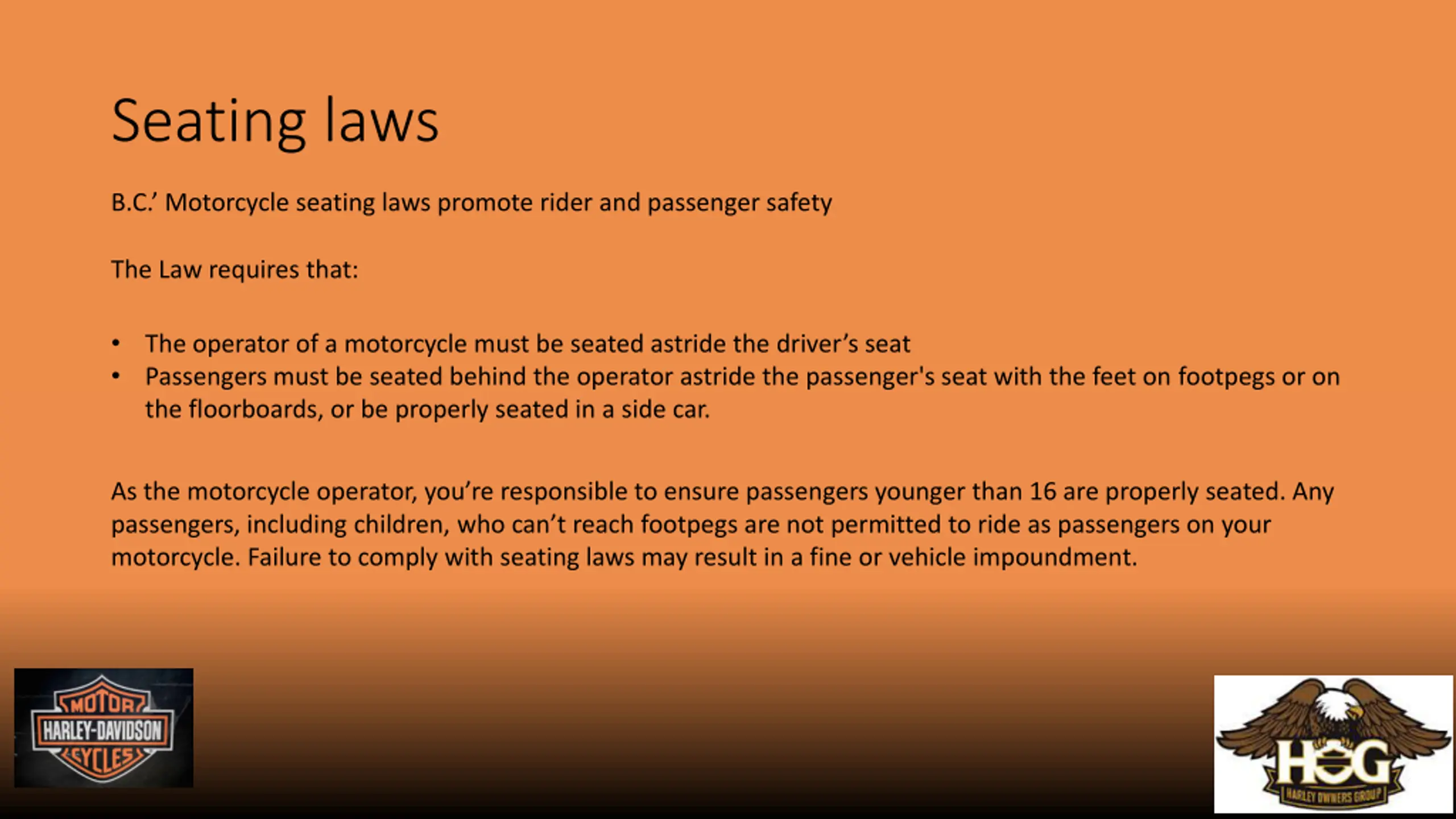 Seating laws B.C. Motorcycle seating laws promote rider and passenger safety The Law requires that: The operator of a motorcycle must be seated astride the driver s seat Passengers must be seated behind the operator astride the passenger's seat with the feet on footpegs or on the floorboards, or be properly seated in a side car. As the motorcycle operator, you re responsible to ensure passengers younger than 16 are properly seated. Any passengers, including children, who can t reach footpegs are not permitted to ride as passengers on your motorcycle. Failure to comply with seating laws may result in a fine or vehicle impoundment.