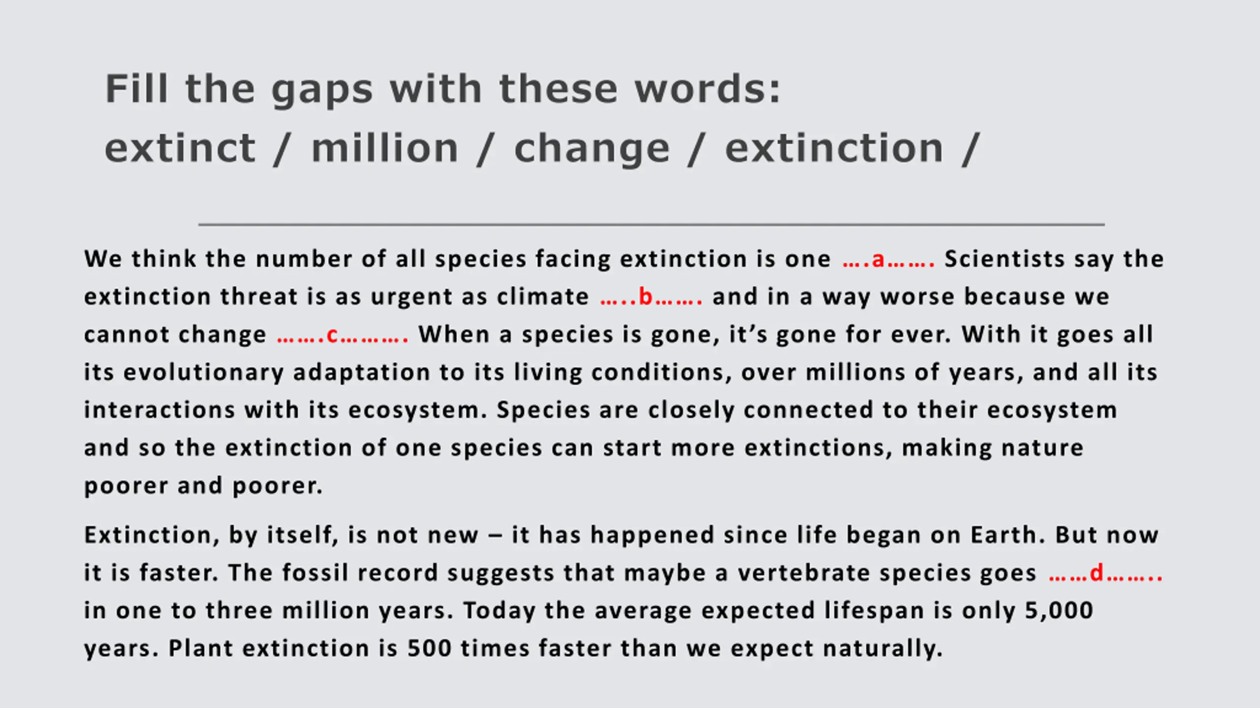 Fill the gaps with these words: extinct / million / change / extinction / We think the number of all species facing extinction is one .a . Scientists say the extinction threat is as urgent as climate ..b . and in a way worse because we cannot change .c . When a species is gone, it s gone for ever. With it goes all its evolutionary adaptation to its living conditions, over millions of years, and all its interactions with its ecosystem. Species are closely connected to their ecosystem and so the extinction of one species can start more extinctions, making nature poorer and poorer. Extinction, by itself, is not new it has happened since life began on Earth. But now it is faster. The fossil record suggests that maybe a vertebrate species goes d .. in one to three million years. Today the average expected lifespan is only 5,000 years. Plant extinction is 500 times faster than we expect naturally.