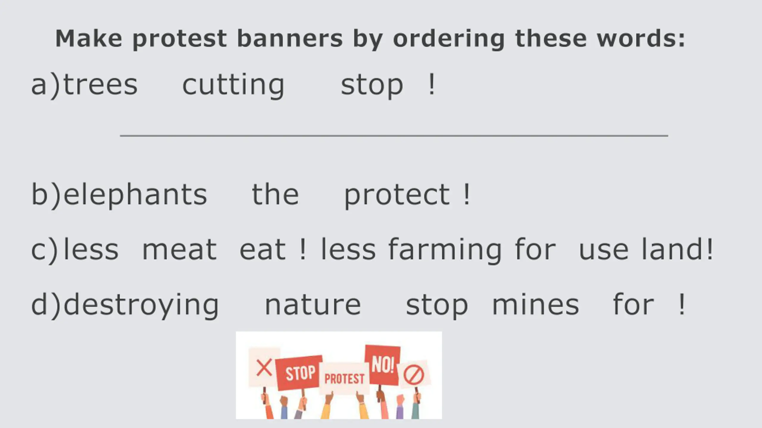 Make protest banners by ordering these words: a)trees cutting stop ! b)elephants the protect ! c)less meat eat ! less farming for use land! d)destroying nature stop mines for !