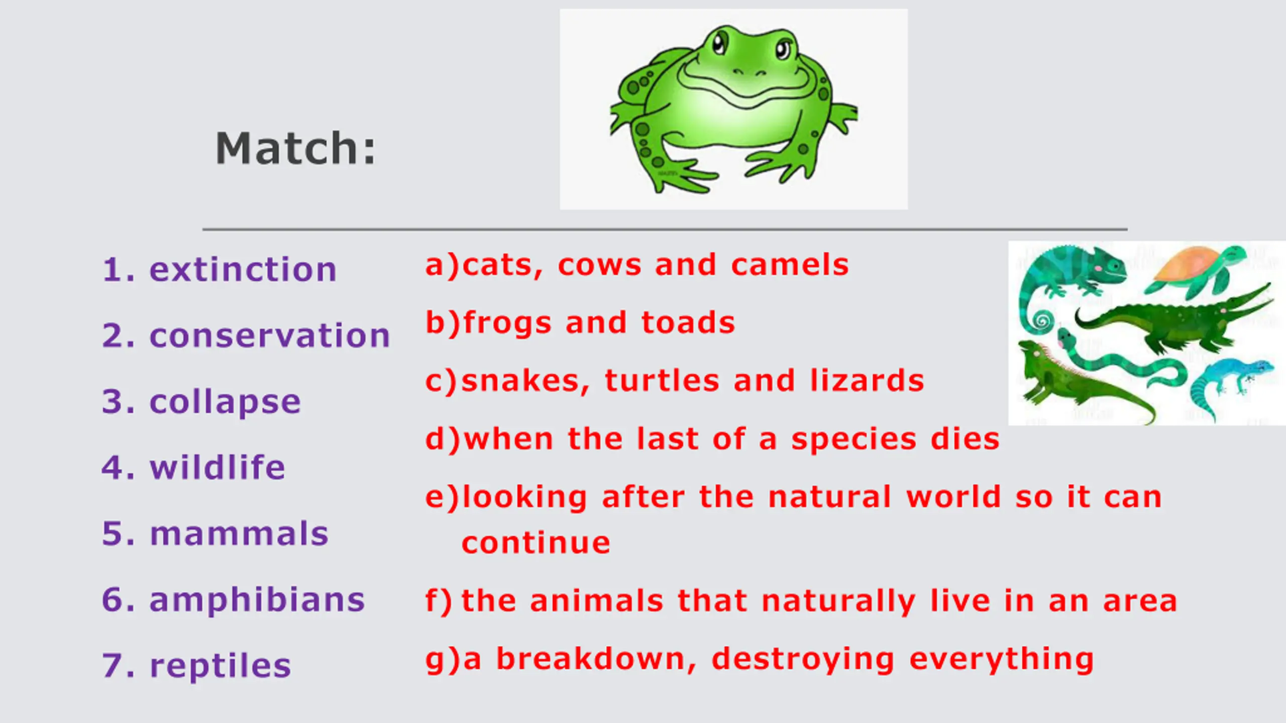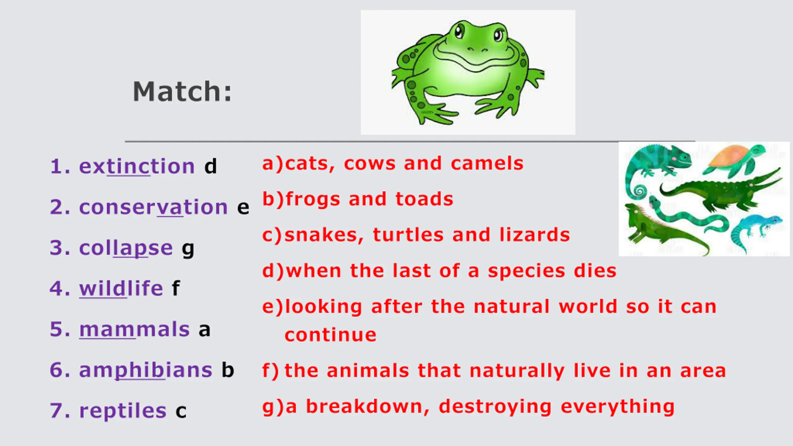 Match: a)cats, cows and camels b)frogs and toads c)snakes, turtles and lizards d)when the last of a species dies e)looking after the natural world so it can continue f) the animals that naturally live in an area g)a breakdown, destroying everything 1. extinction d 2. conservation e 3. collapse g 4. wildlife f 5. mammals a 6. amphibians b 7. reptiles c