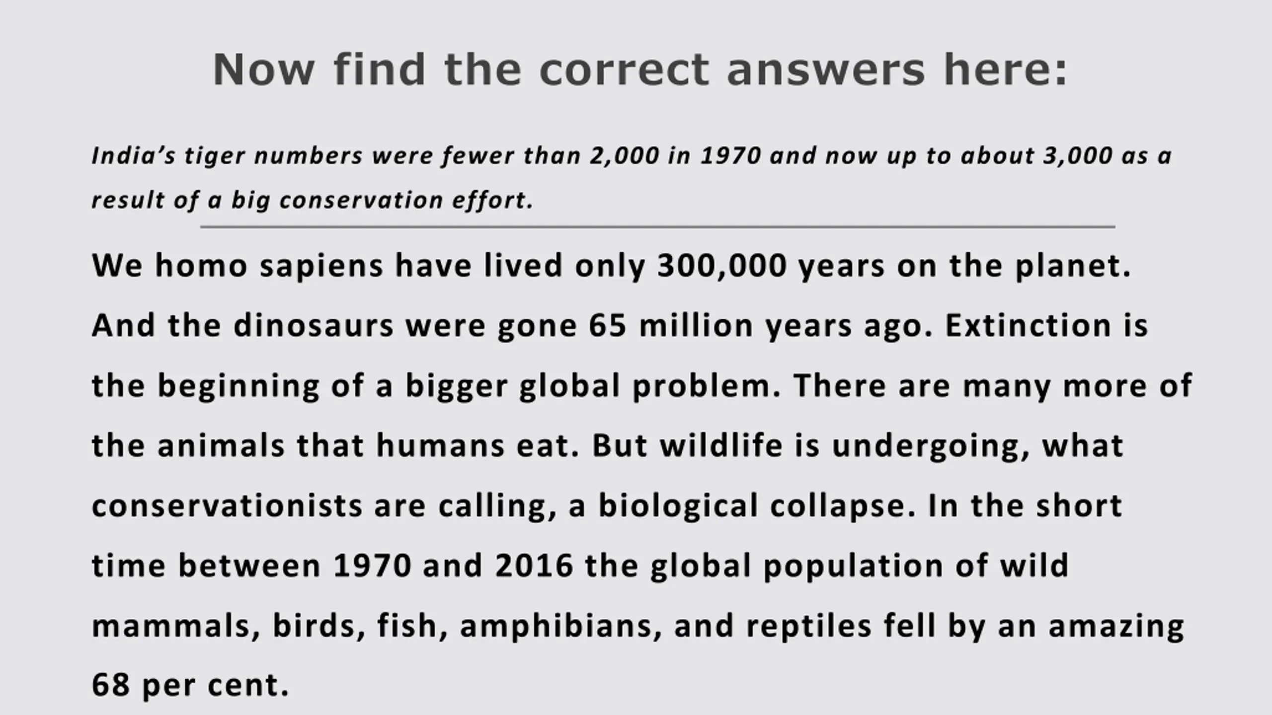 Now find the correct answers here: India s tiger numbers were fewer than 2,000 in 1970 and now up to about 3,000 as a result of a big conservation effort. We homo sapiens have lived only 300,000 years on the planet. And the dinosaurs were gone 65 million years ago. Extinction is the beginning of a bigger global problem. There are many more of the animals that humans eat. But wildlife is undergoing, what conservationists are calling, a biological collapse. In the short time between 1970 and 2016 the global population of wild mammals, birds, fish, amphibians, and reptiles fell by an amazing 68 per cent.