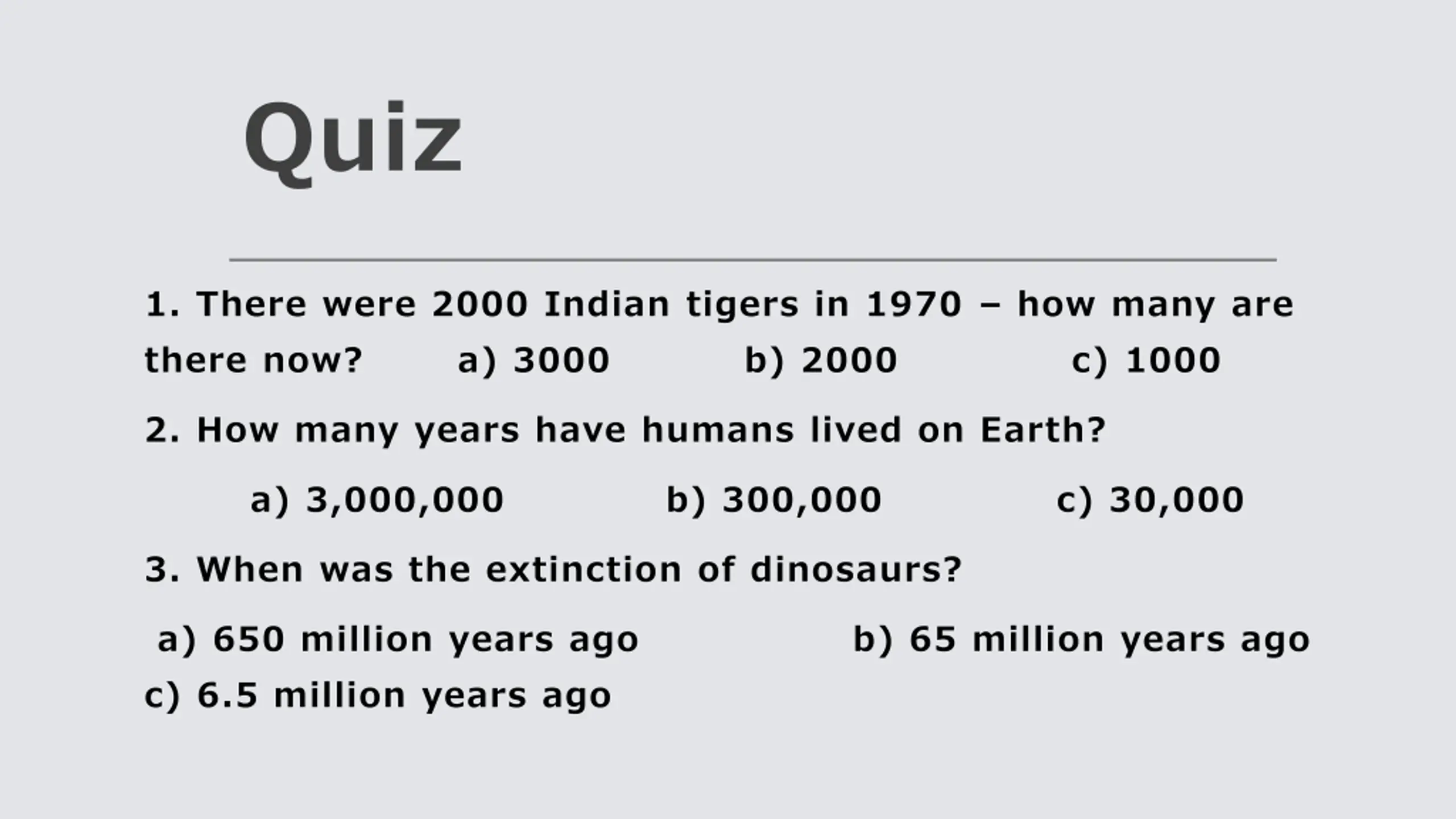 Quiz 1. There were 2000 Indian tigers in 1970 how many are there now? a) 3000 b) 2000 c) 1000 2. How many years have humans lived on Earth? a) 3,000,000 b) 300,000 c) 30,000 3. When was the extinction of dinosaurs? a) 650 million years ago b) 65 million years ago c) 6.5 million years ago