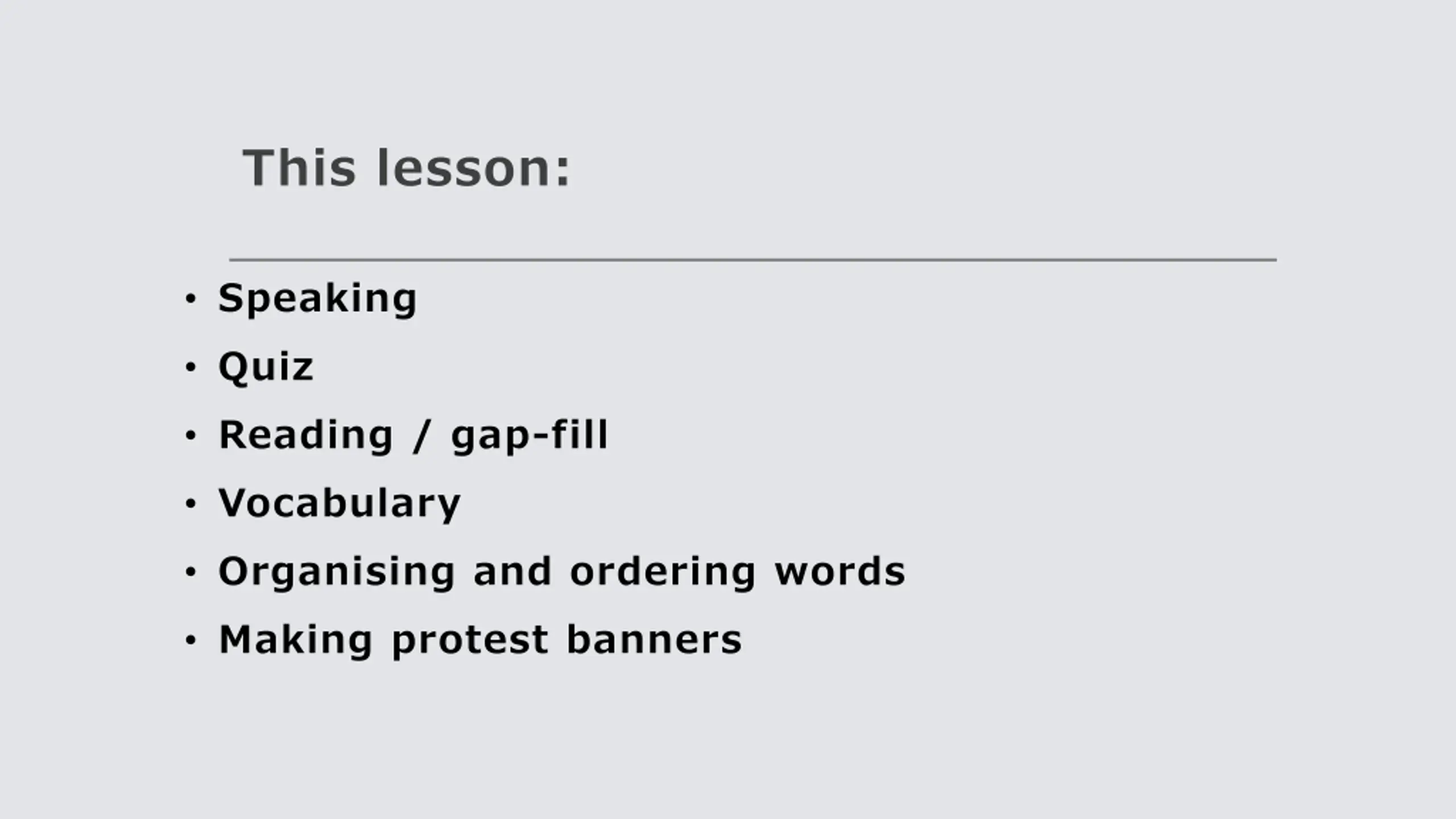 This lesson: Speaking Quiz Reading / gap-fill Vocabulary Organising and ordering words Making protest banners