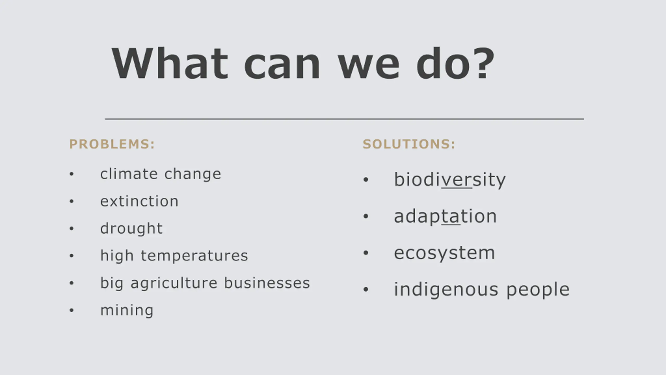 What can we do? SOLUTIONS: PROBLEMS: climate change extinction drought high temperatures big agriculture businesses mining biodiversity adaptation ecosystem indigenous people