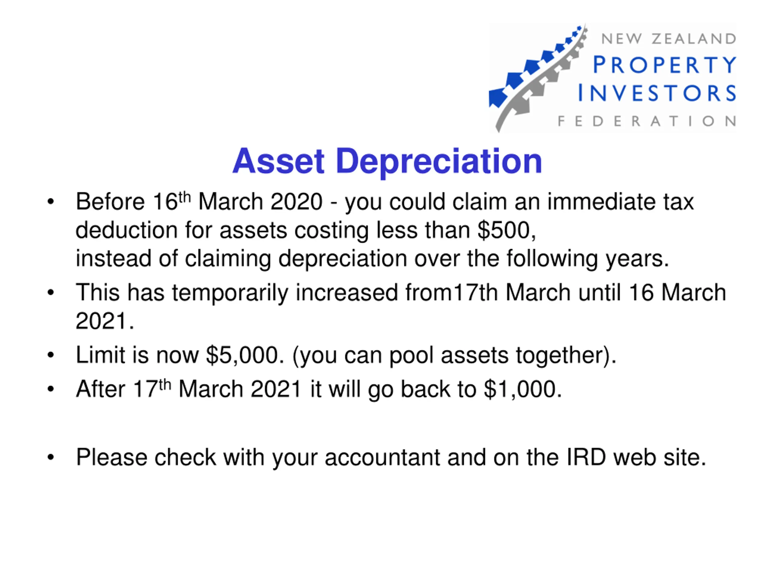 Asset Depreciation Before 16thMarch 2020 - you could claim an immediate tax deduction for assets costing less than $500, instead of claiming depreciation over the following years. This has temporarily increased from17th March until 16 March 2021. Limit is now $5,000. (you can pool assets together). After 17thMarch 2021 it will go back to $1,000. Please check with your accountant and on the IRD web site.