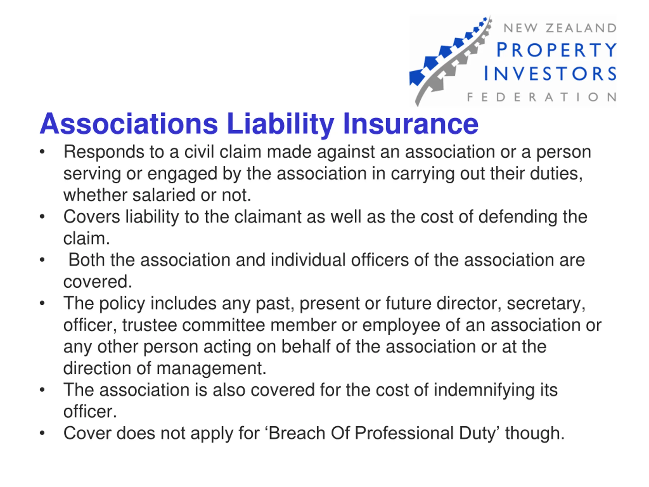 Associations Liability Insurance Responds to a civil claim made against an association or a person serving or engaged by the association in carrying out their duties, whether salaried or not. Covers liability to the claimant as well as the cost of defending the claim. Both the association and individual officers of the association are covered. The policy includes any past, present or future director, secretary, officer, trustee committee member or employee of an association or any other person acting on behalf of the association or at the direction of management. The association is also covered for the cost of indemnifying its officer. Cover does not apply for Breach Of Professional Duty though.