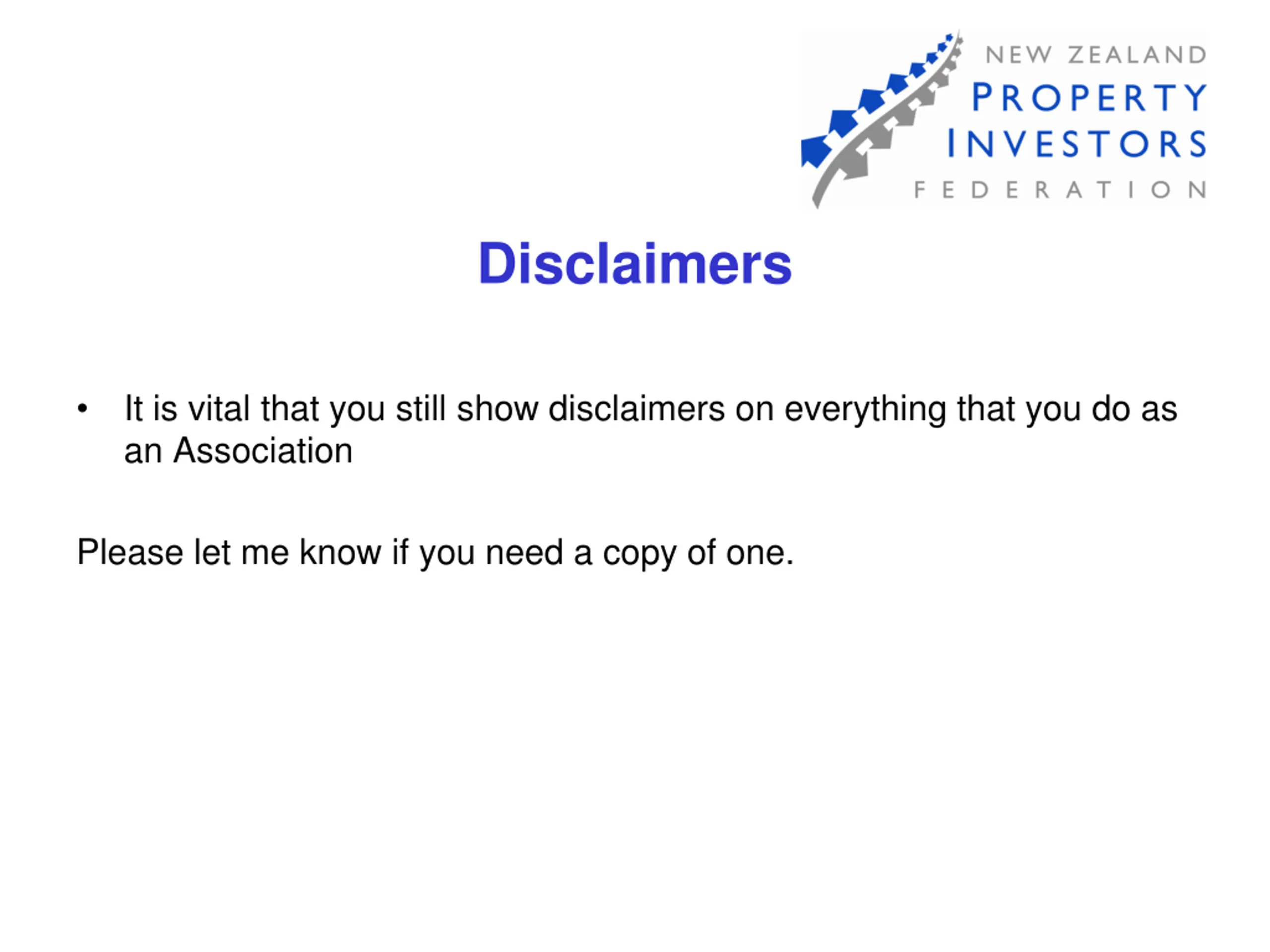 Disclaimers It is vital that you still show disclaimers on everything that you do as an Association Please let me know if you need a copy of one.