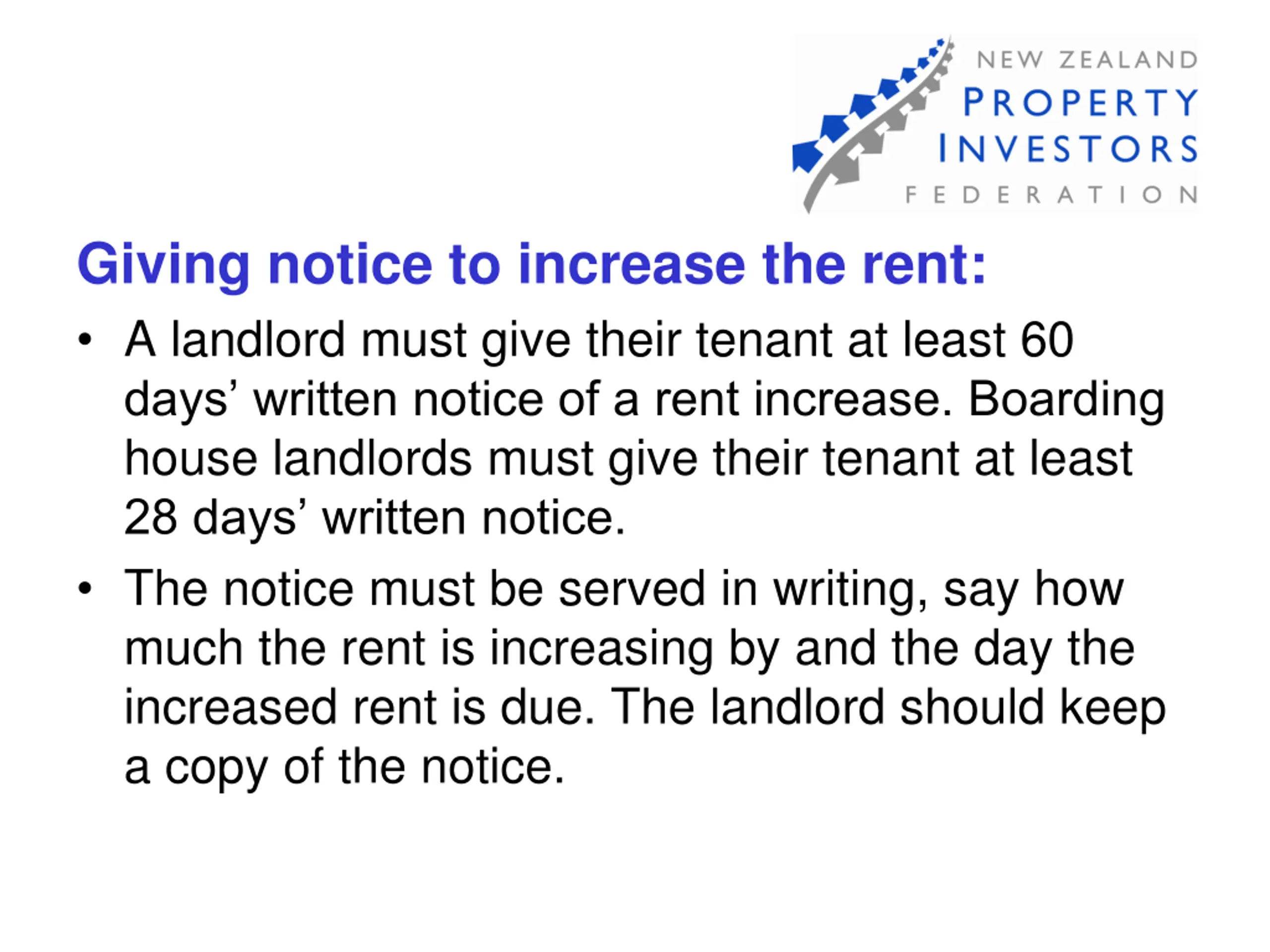 Giving notice to increase the rent: A landlord must give their tenant at least 60 days written notice of a rent increase. Boarding house landlords must give their tenant at least 28 days written notice. The notice must be served in writing, say how much the rent is increasing by and the day the increased rent is due. The landlord should keep a copy of the notice.