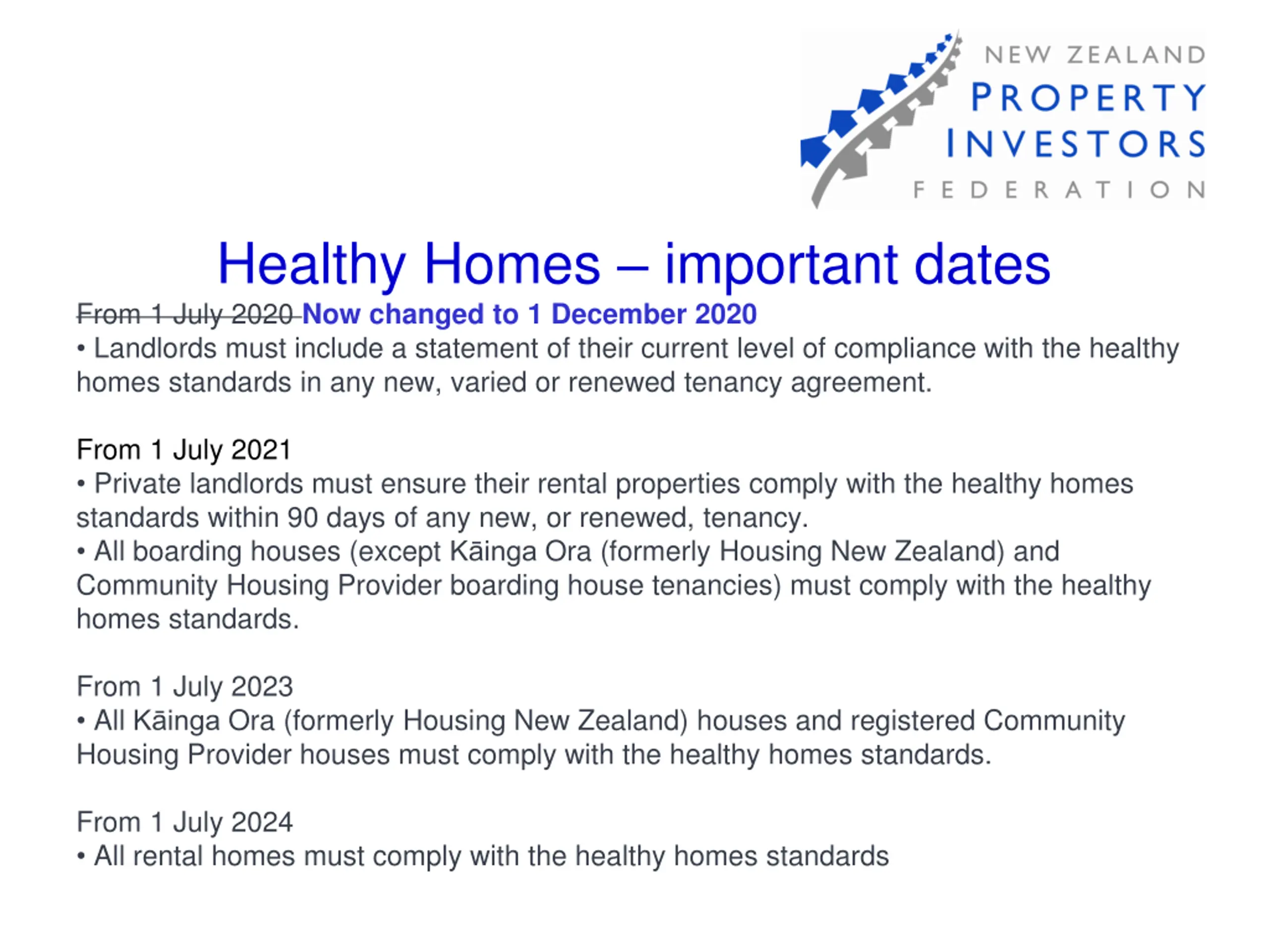 Healthy Homes important dates From 1 July 2020 Now changed to 1 December 2020 Landlords must include a statement of their current level of compliance with the healthy homes standards in any new, varied or renewed tenancy agreement. From 1 July 2021 Private landlords must ensure their rental properties comply with the healthy homes standards within 90 days of any new, or renewed, tenancy. All boarding houses (except K inga Ora (formerly Housing New Zealand) and Community Housing Provider boarding house tenancies) must comply with the healthy homes standards. From 1 July 2023 All K inga Ora (formerly Housing New Zealand) houses and registered Community Housing Provider houses must comply with the healthy homes standards. From 1 July 2024 All rental homes must comply with the healthy homes standards