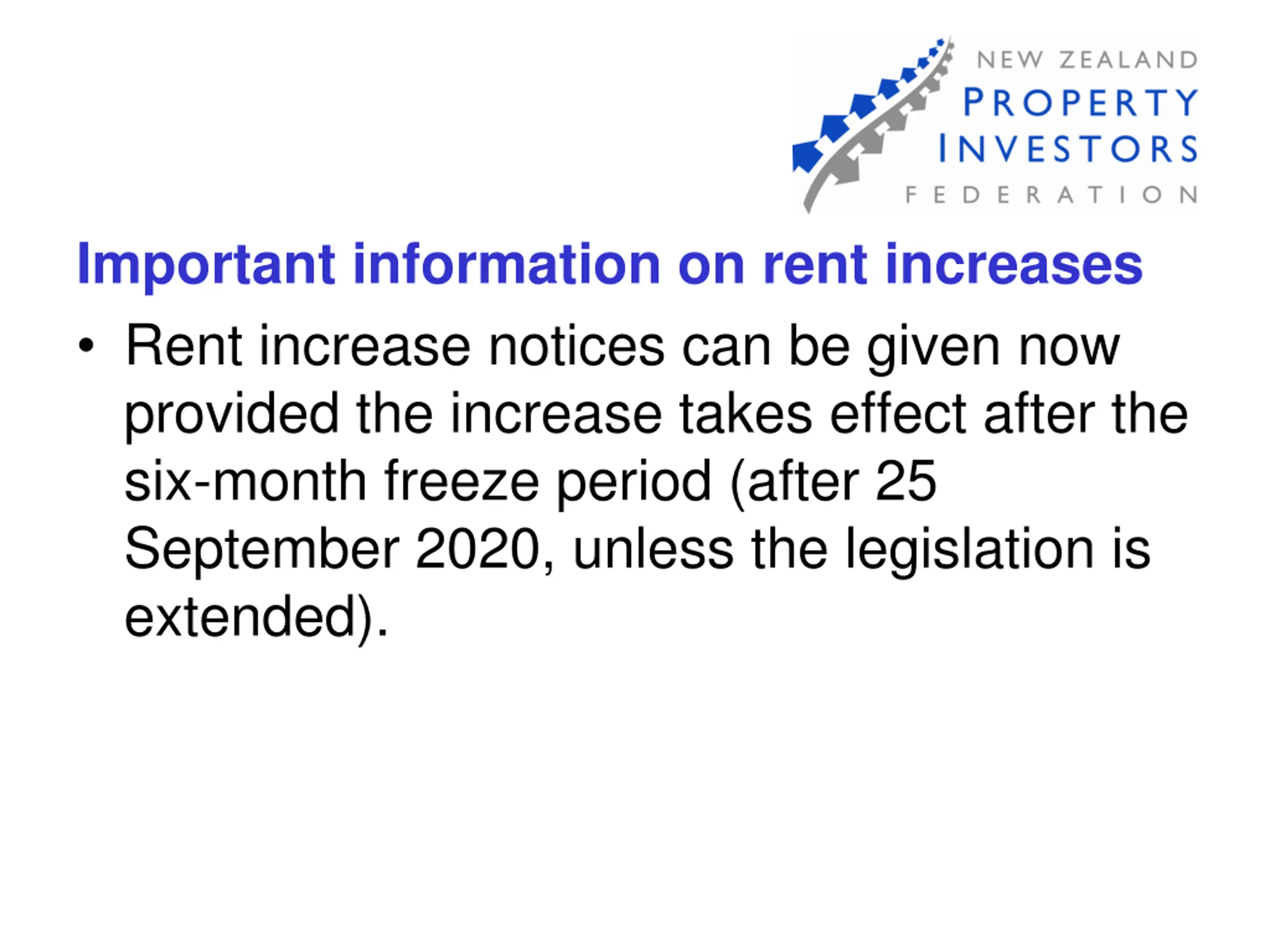 Important information on rent increases Rent increase notices can be given now provided the increase takes effect after the six-month freeze period (after 25 September 2020, unless the legislation is extended).