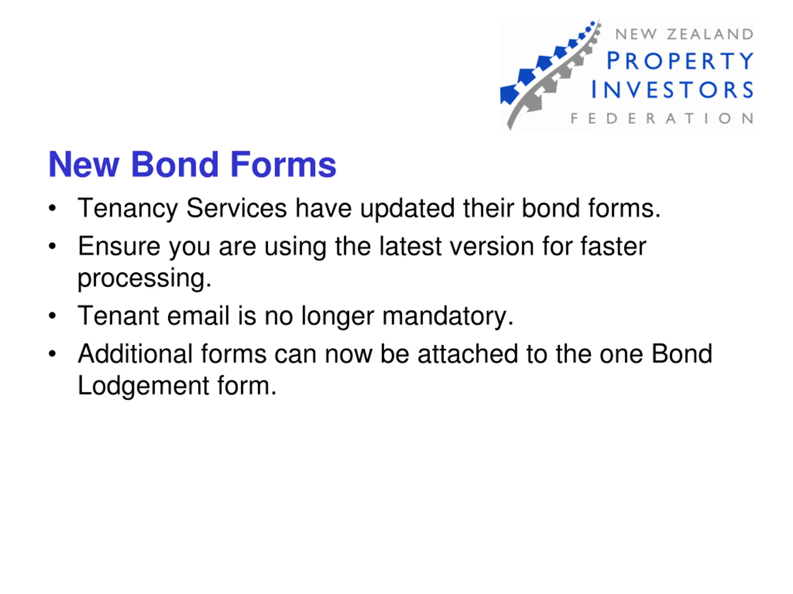 New Bond Forms Tenancy Services have updated their bond forms. Ensure you are using the latest version for faster processing. Tenant email is no longer mandatory. Additional forms can now be attached to the one Bond Lodgement form.
