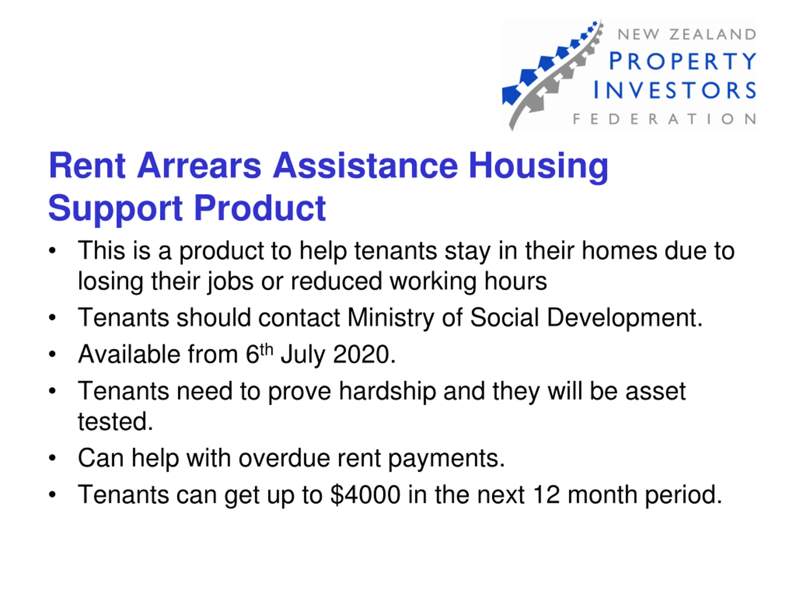 Rent Arrears Assistance Housing Support Product This is a product to help tenants stay in their homes due to losing their jobs or reduced working hours Tenants should contact Ministry of Social Development. Available from 6thJuly 2020. Tenants need to prove hardship and they will be asset tested. Can help with overdue rent payments. Tenants can get up to $4000 in the next 12 month period.