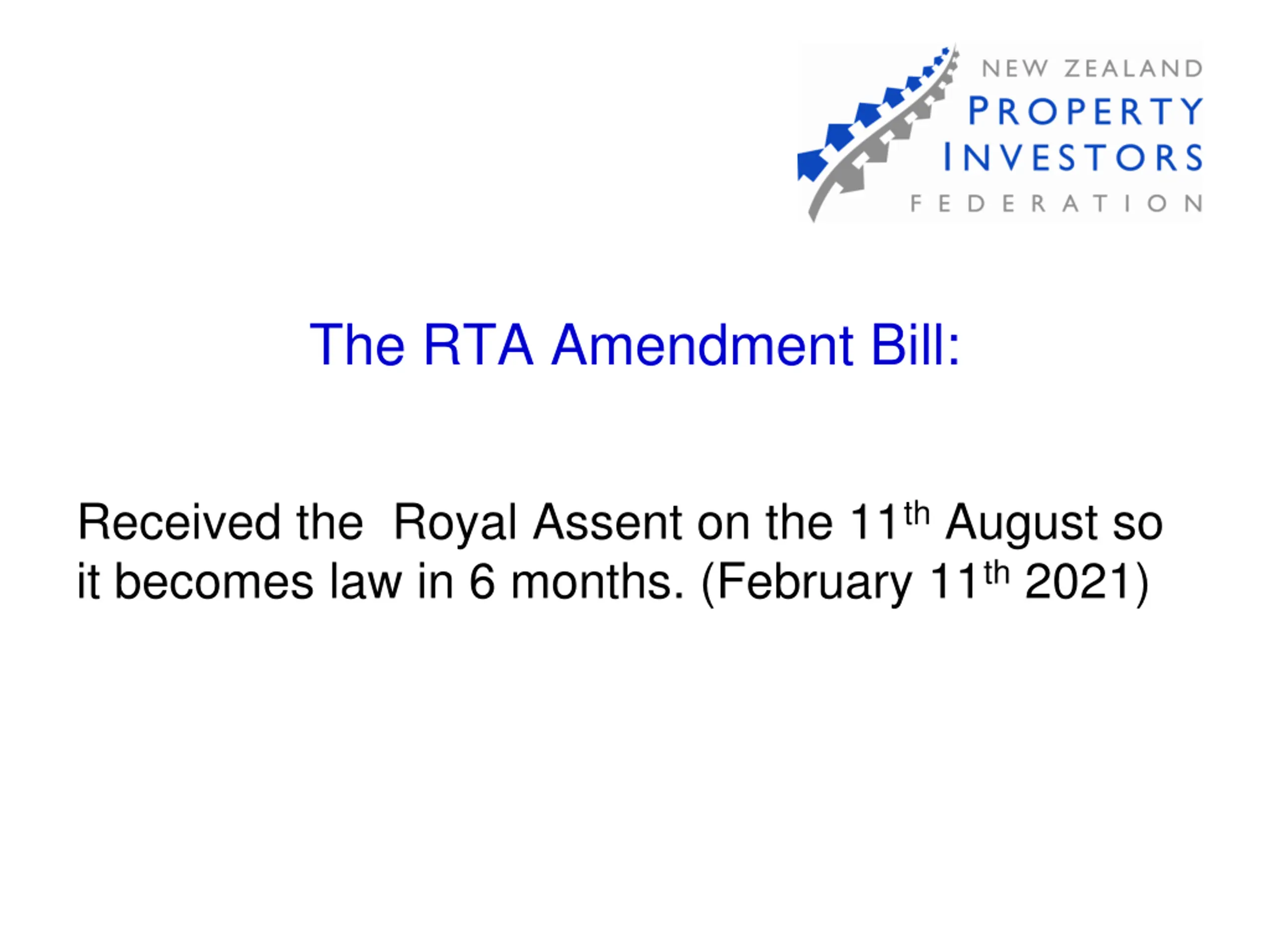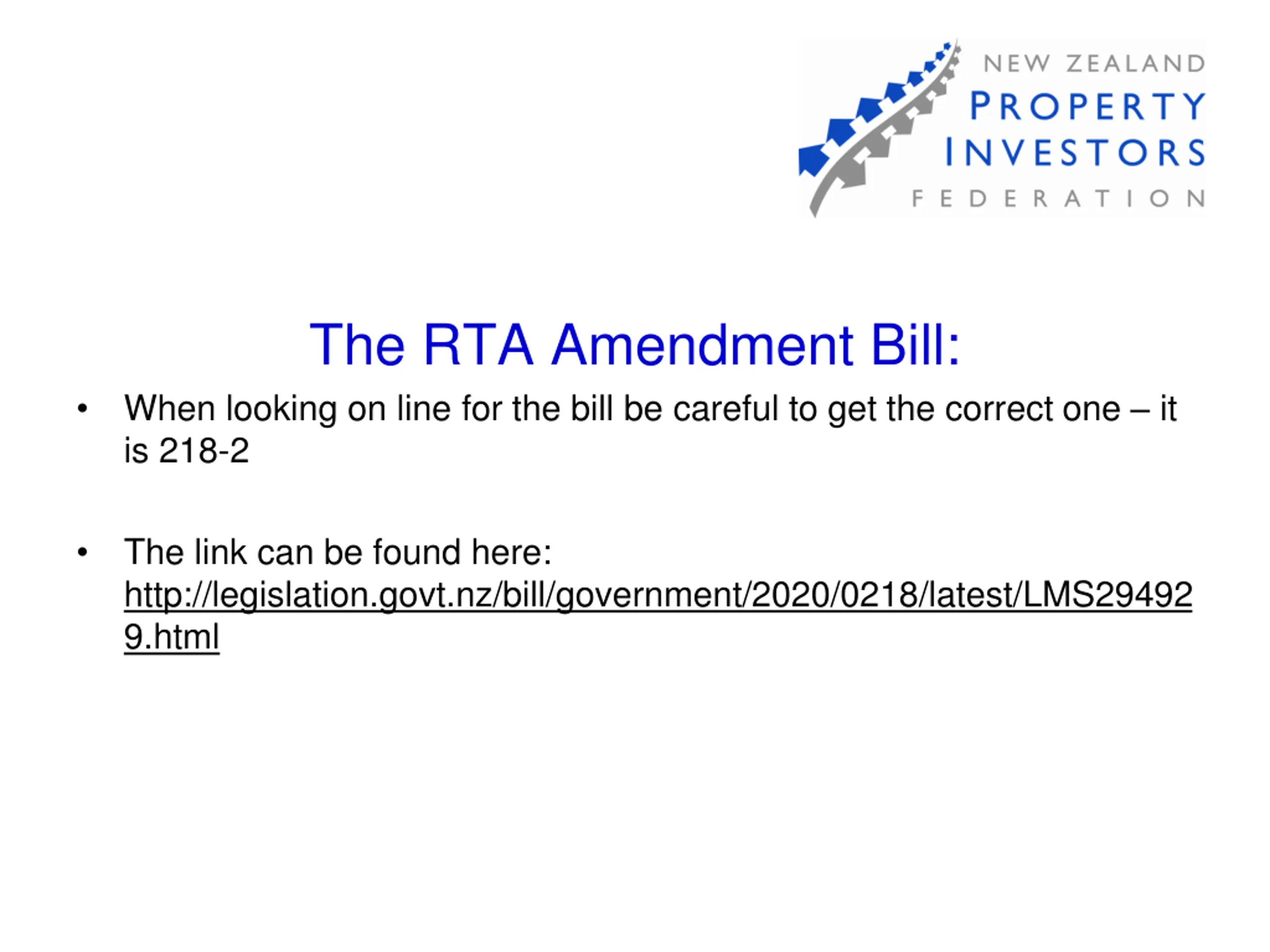 The RTA Amendment Bill: When looking on line for the bill be careful to get the correct one it is 218-2 The link can be found here: http://legislation.govt.nz/bill/government/2020/0218/latest/LMS29492 9.html