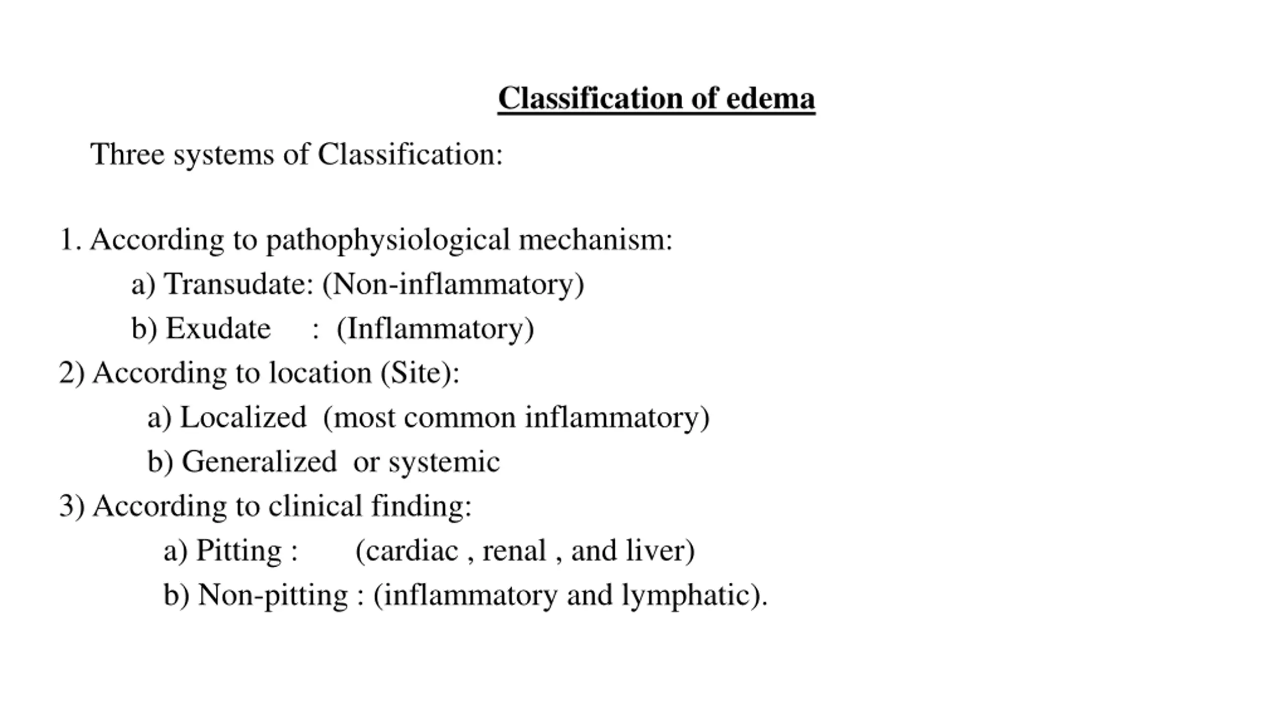 Classification of edema Three systems of Classification: 1. According to pathophysiological mechanism: a) Transudate: (Non-inflammatory) b) Exudate : (Inflammatory) 2) According to location (Site): a) Localized (most common inflammatory) b) Generalized or systemic 3) According to clinical finding: a) Pitting : (cardiac , renal , and liver) b) Non-pitting : (inflammatory and lymphatic).